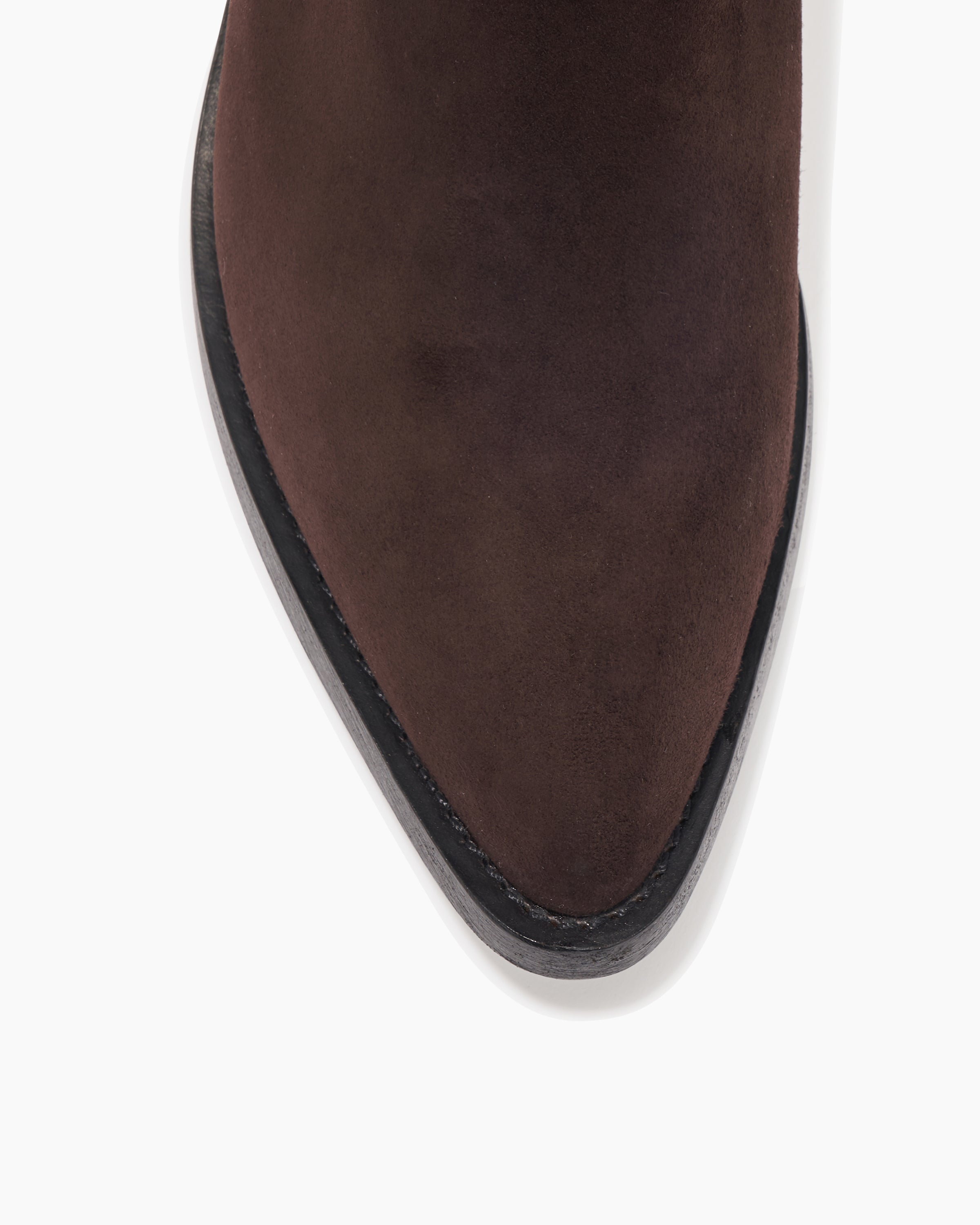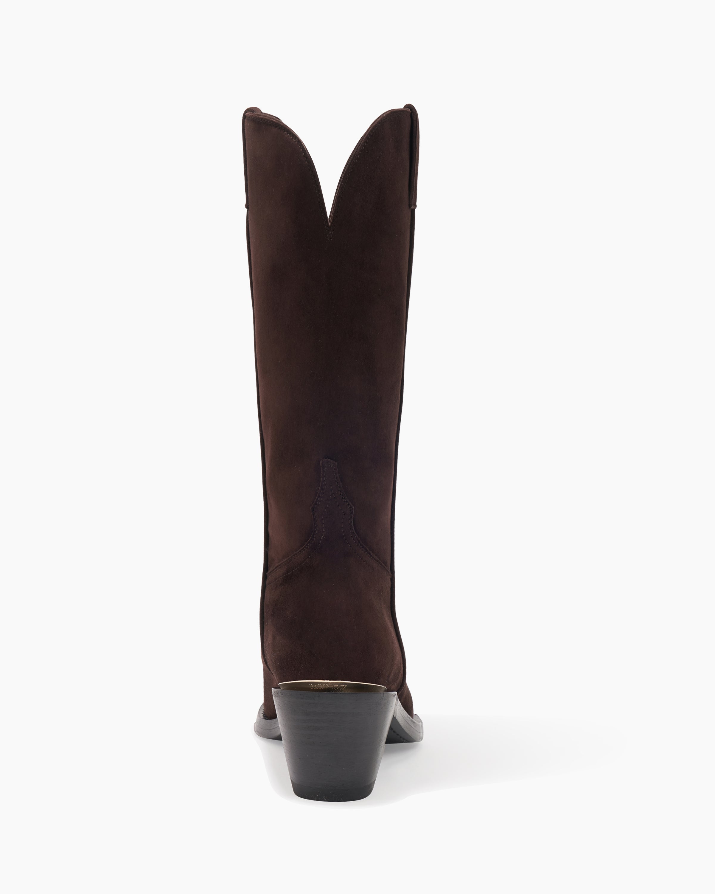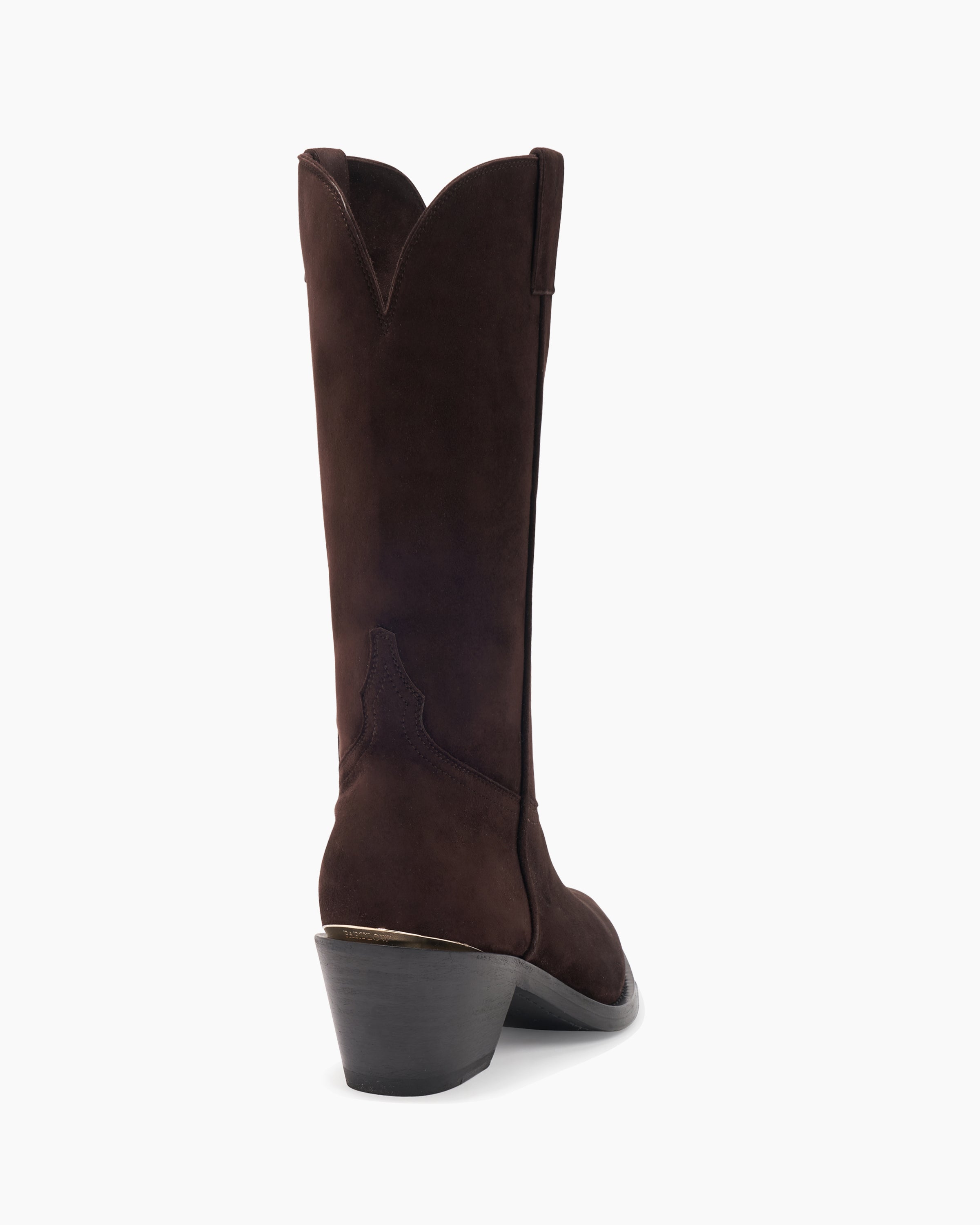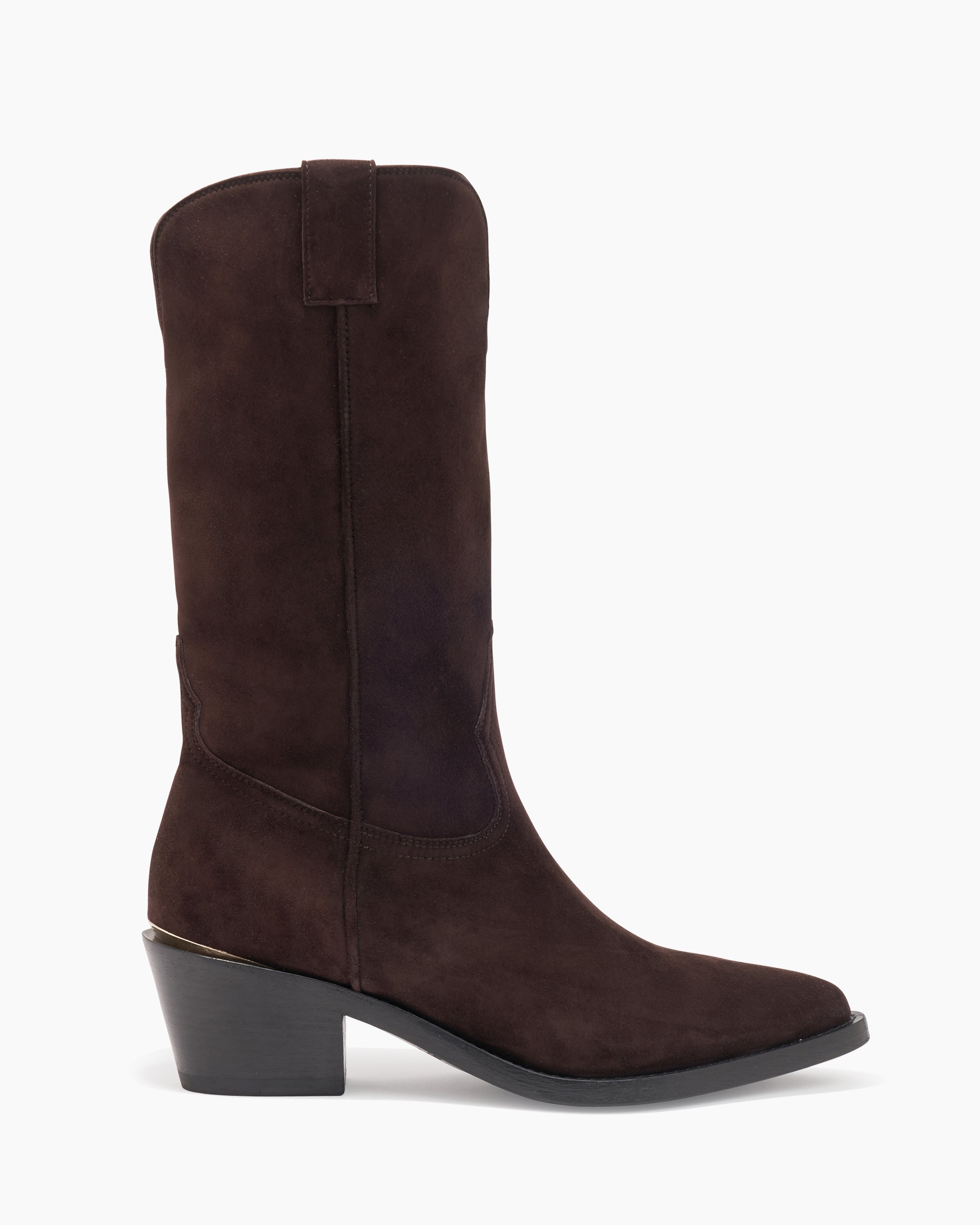 Pull-on mid calf boot. Classic cowboy silhouette. Nappa upper. 55mm/2.16" heel height. 6mm padded insole. Leather lining. Leather outsole with stitched welt. Signature Partlow plaque. Handcrafted in Italy.