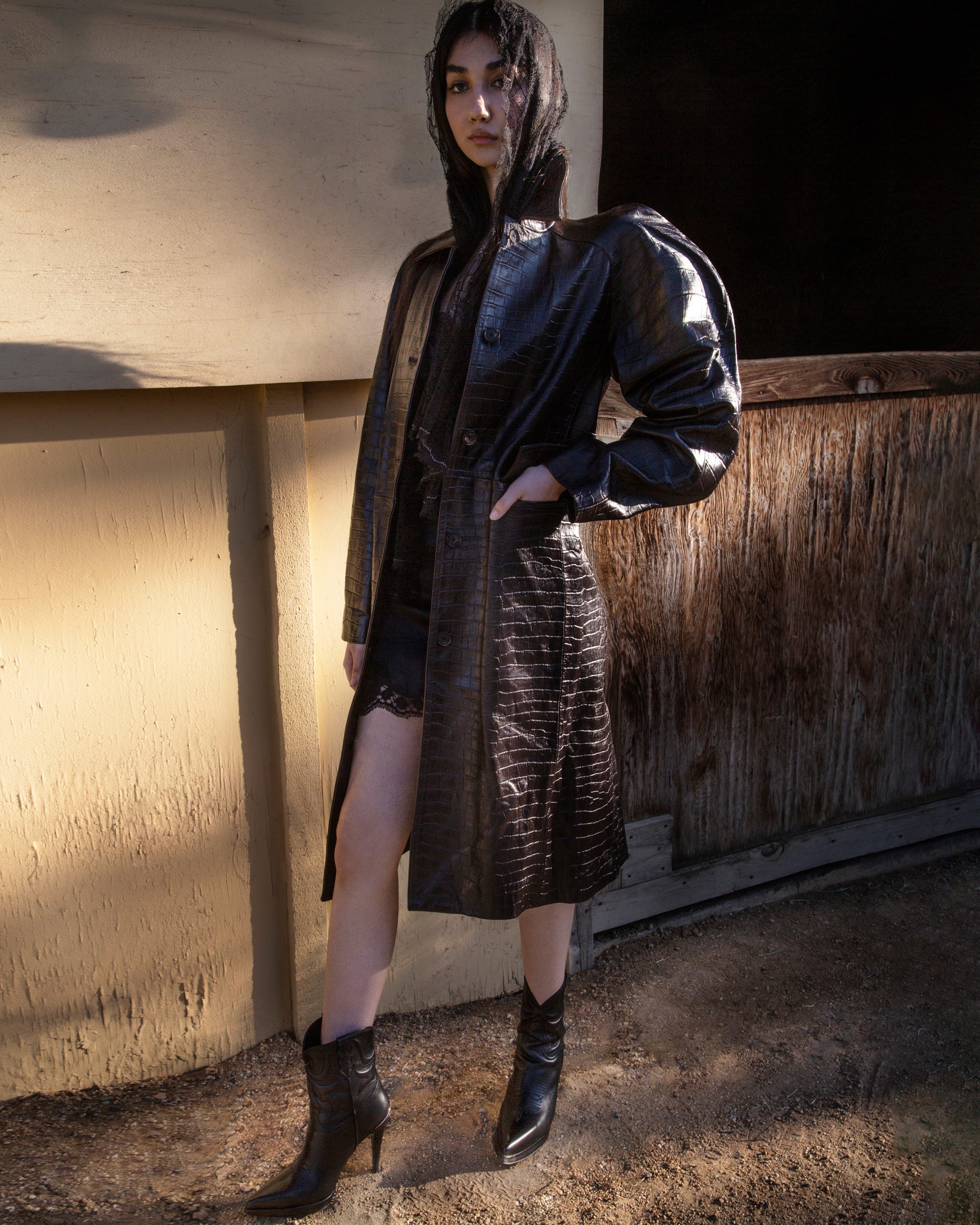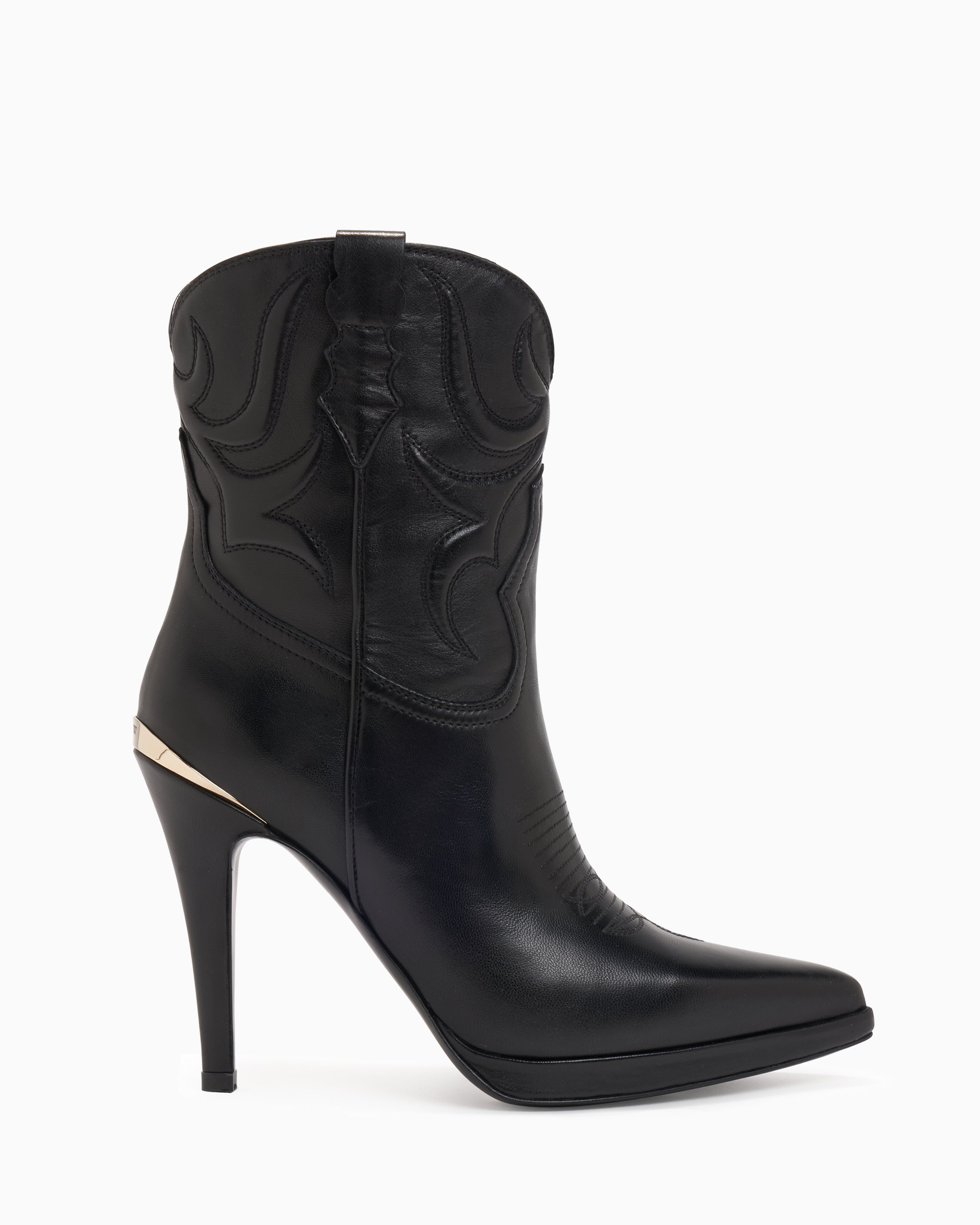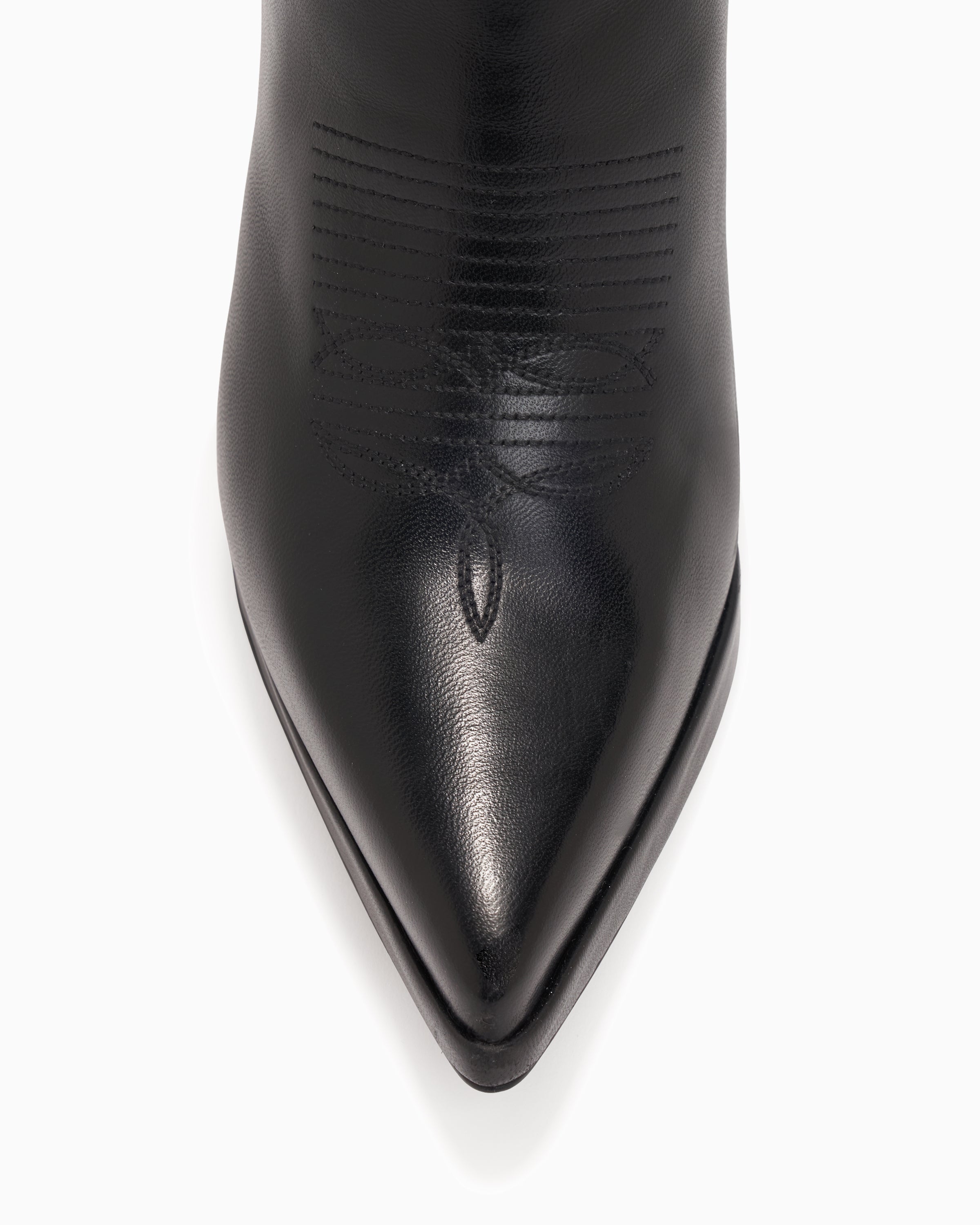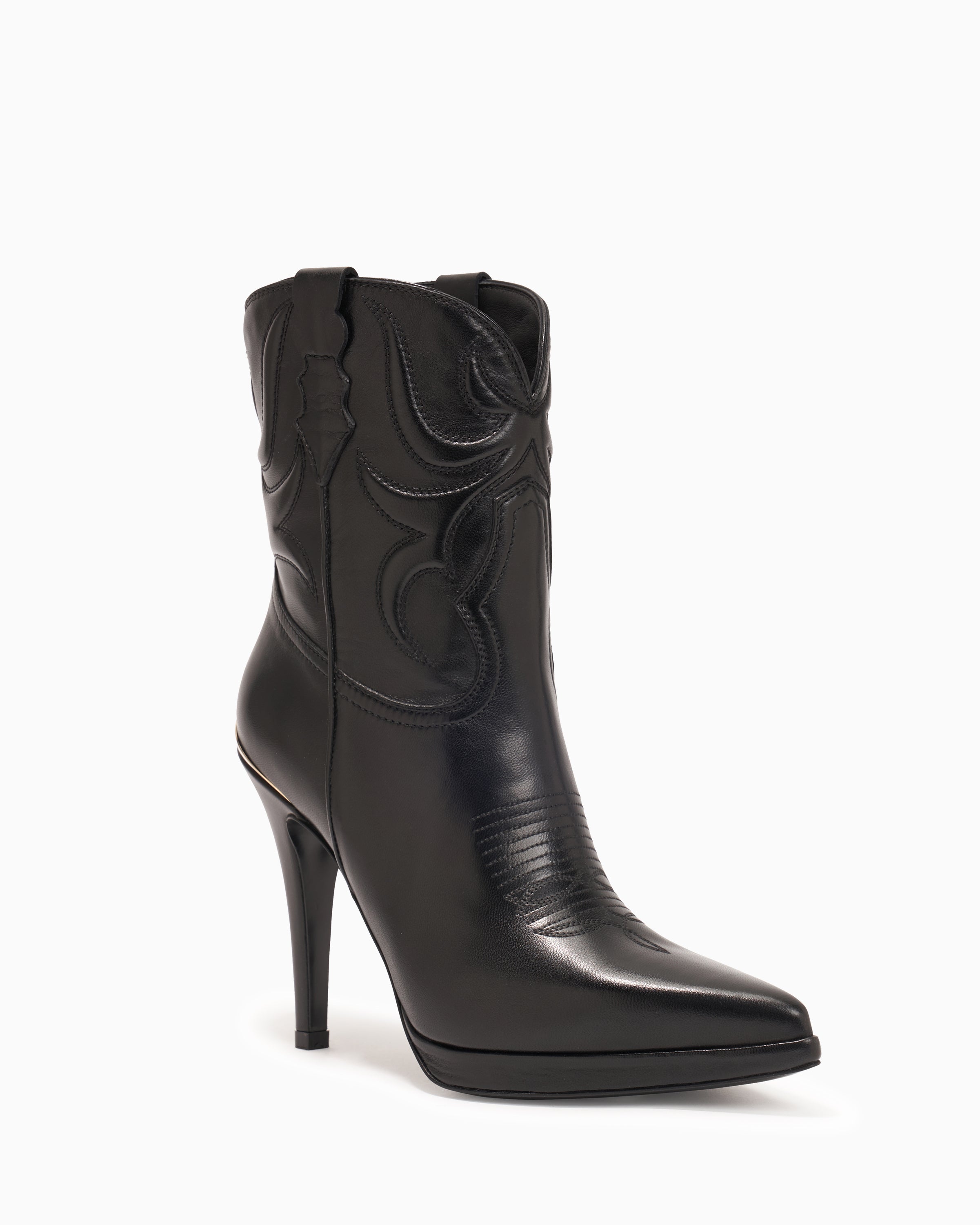 Pull-on ankle boot with classic cowboy silhouette. Nappa upper with quilted design shaft. 95mm/3.54" heel with 15mm/0.59" platform. 6mm padded insole. Leather lining. Leather outsole. Signature Partlow plaque. Handcrafted in Italy.