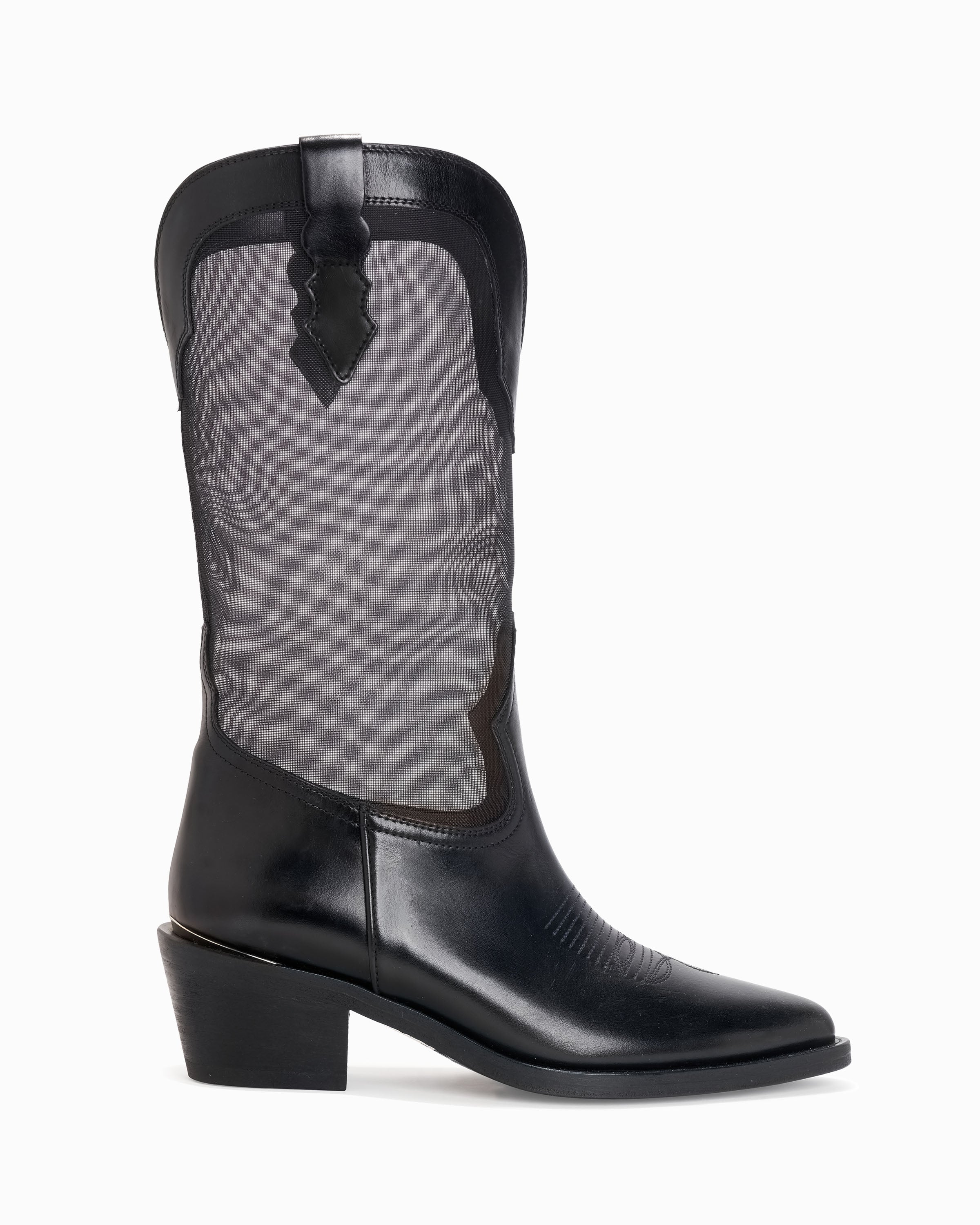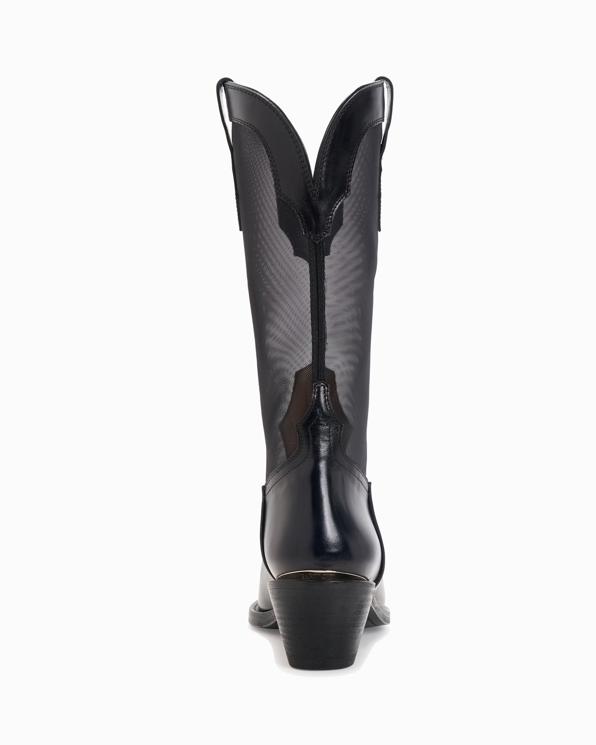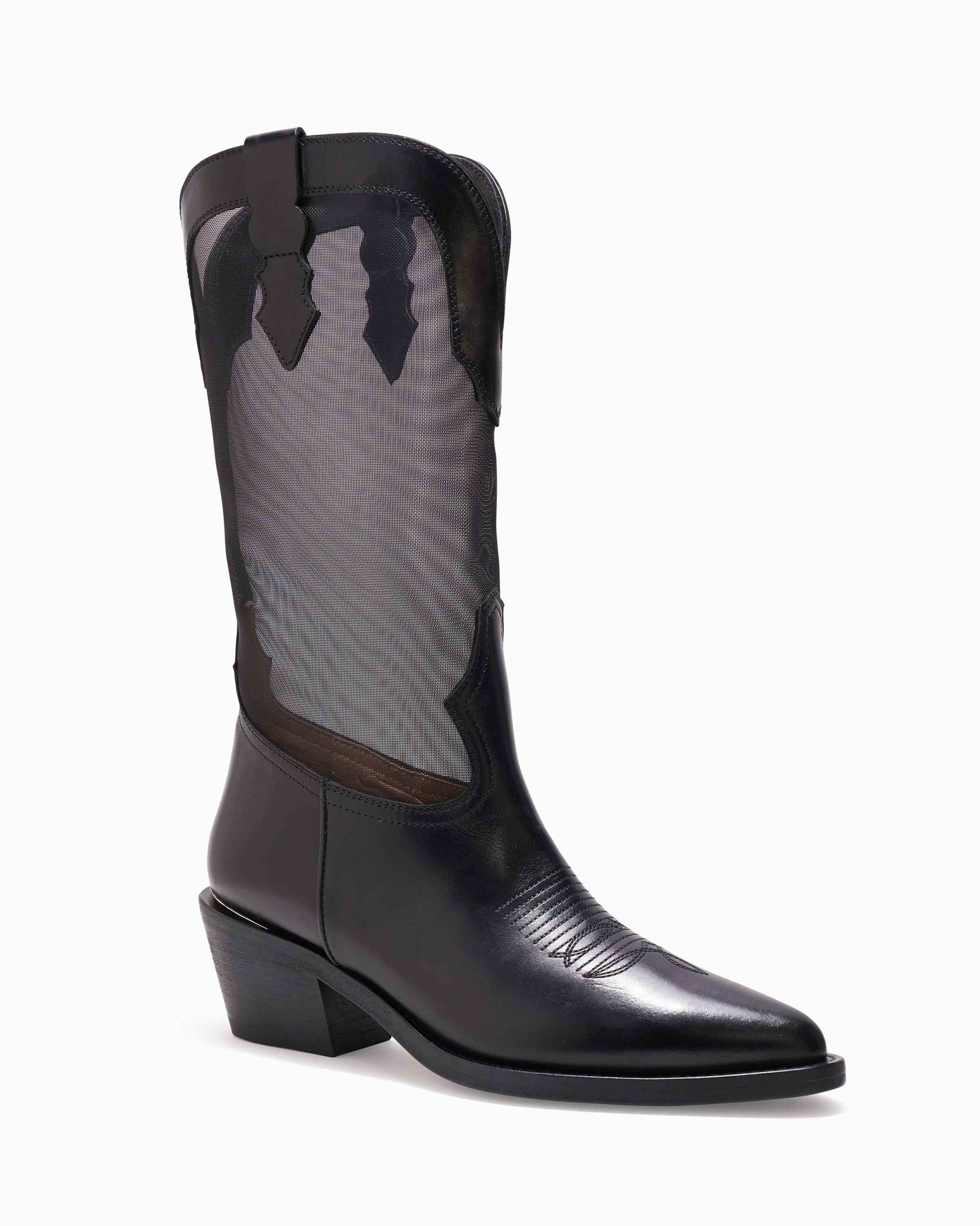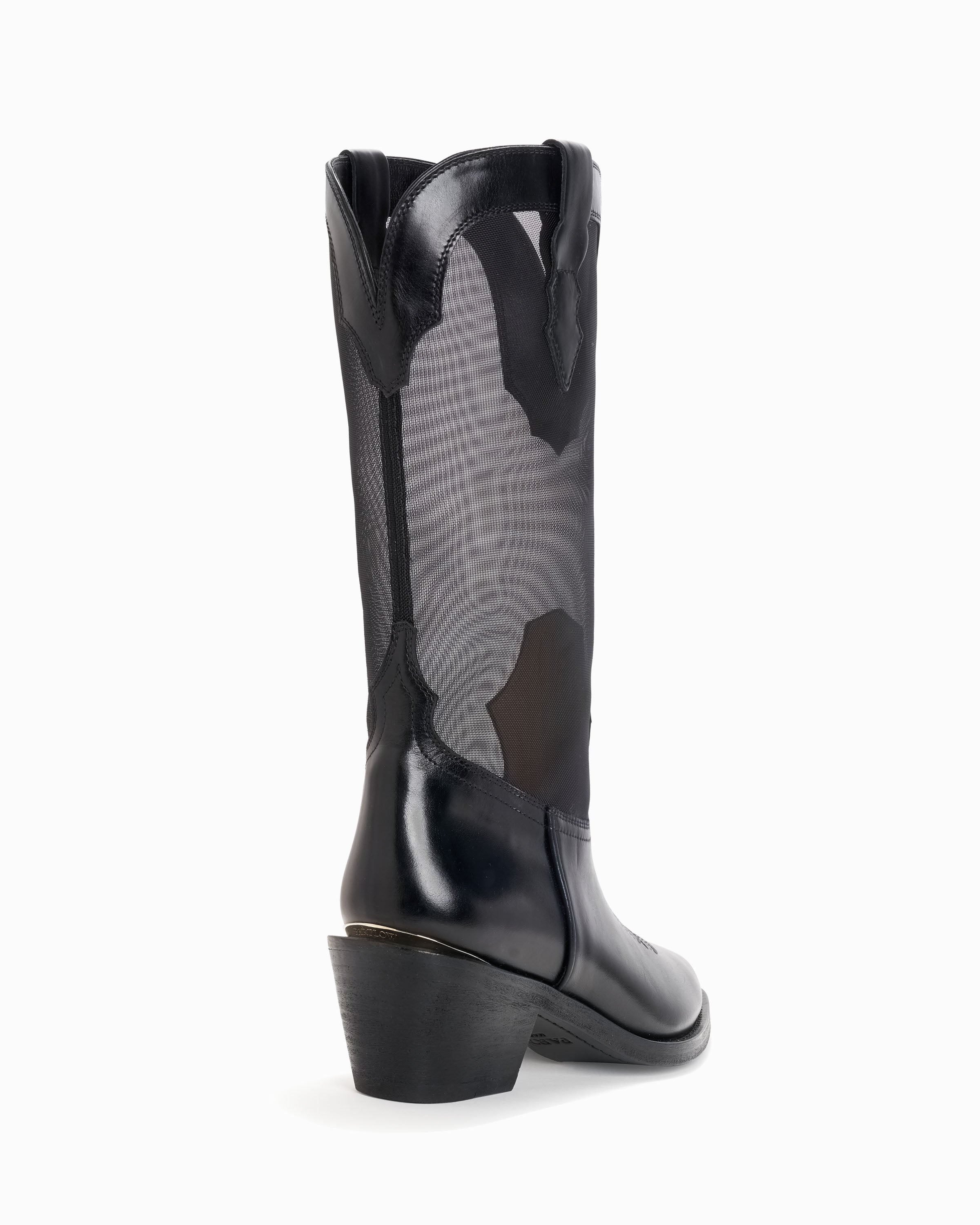 Pull on mid-calf boot. Suede and mesh upper. 55mm/2.16" heel height. 6mm padded insole. Leather lining. Leather outsole with stitched welt. Signature Partlow plaque. Handcrafted in Italy.