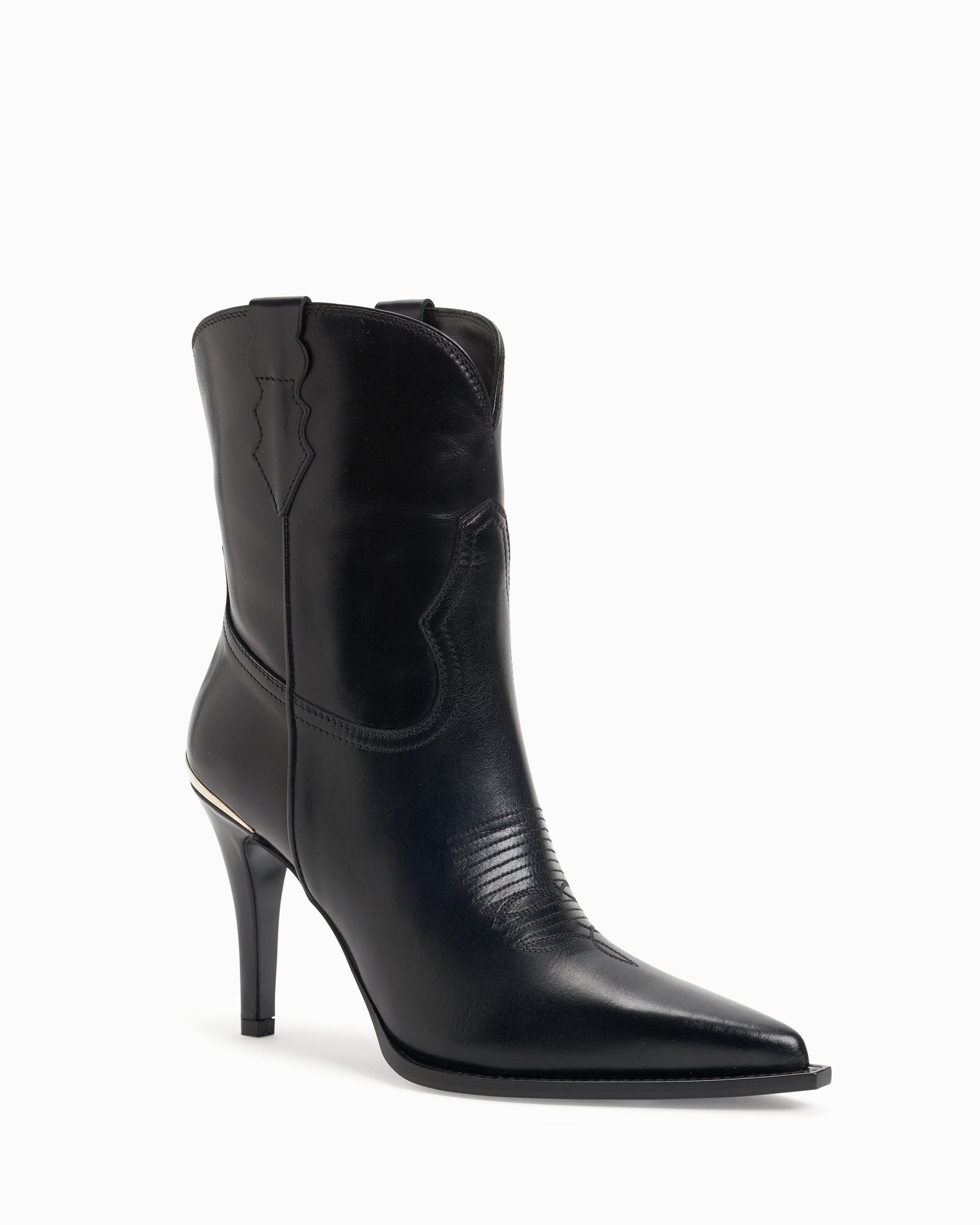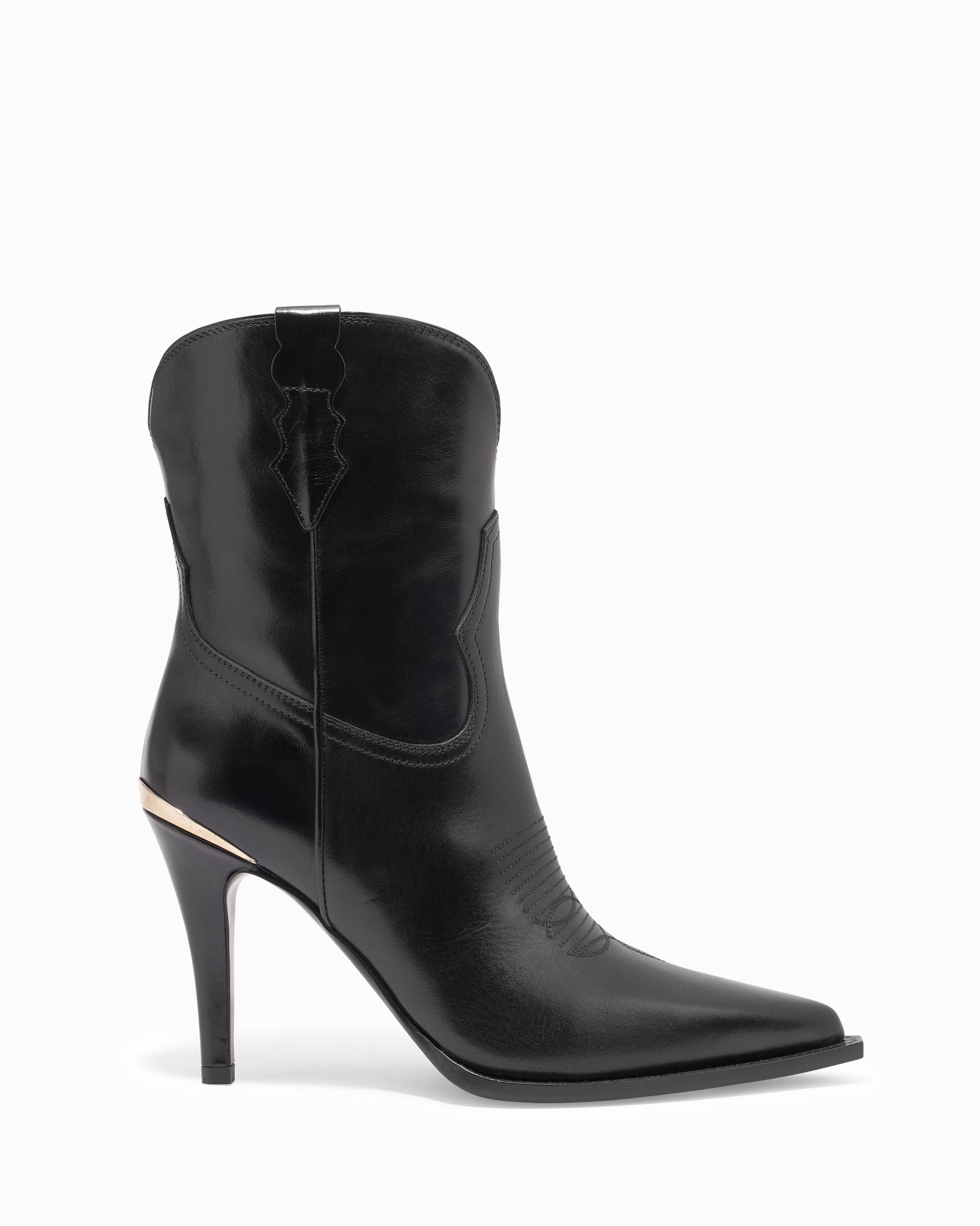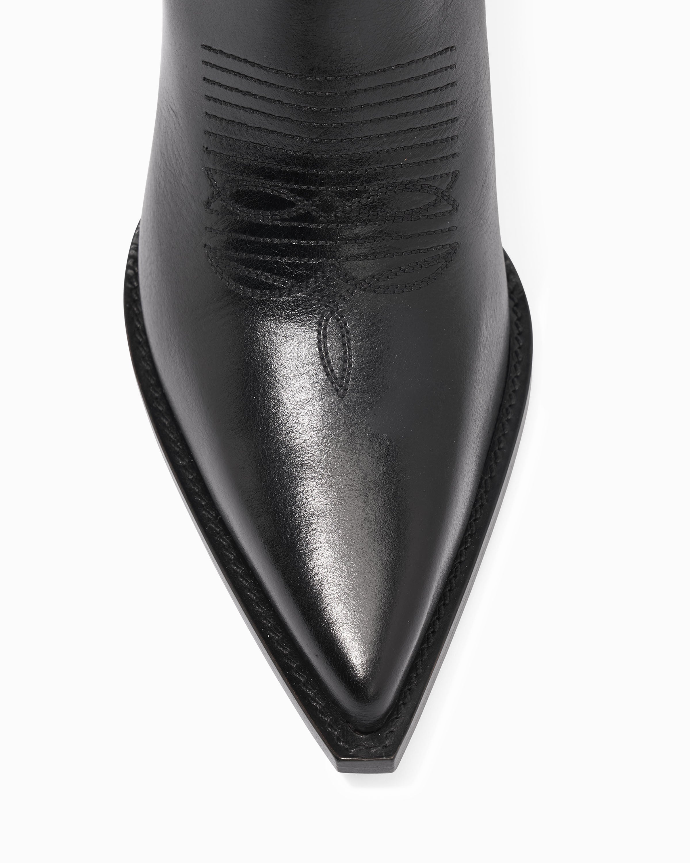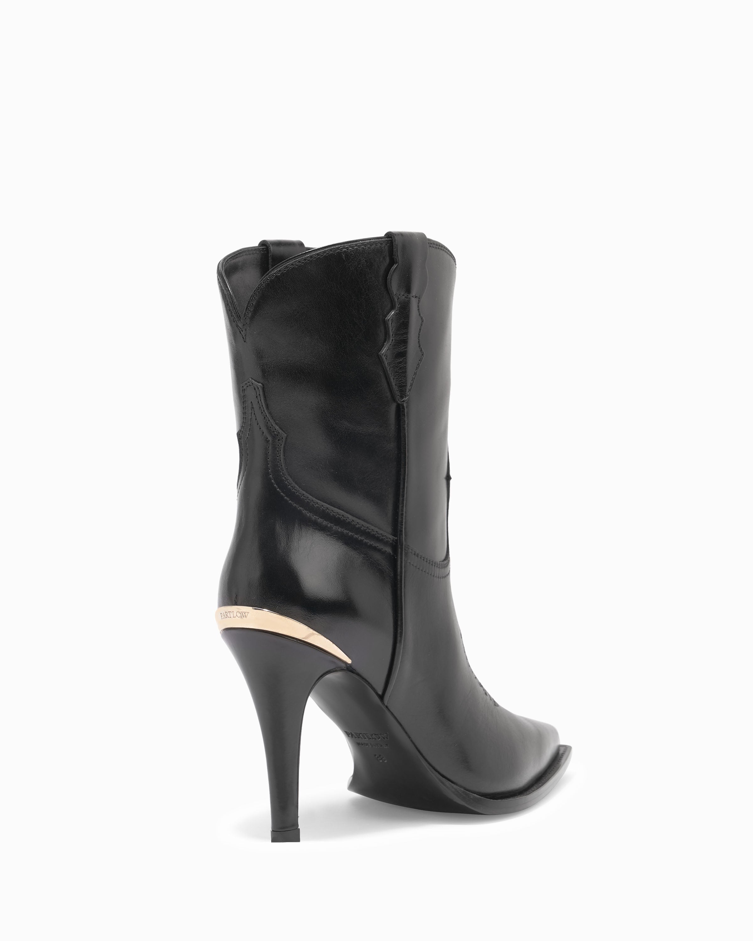 Pull on classic ankle boot. Shiny calf leather upper. 95mm/3.75" heel height. 6mm padded insole. Leather lining. Leather outsole with stitched welt. Signature Partlow plaque. Handcrafted in Italy.