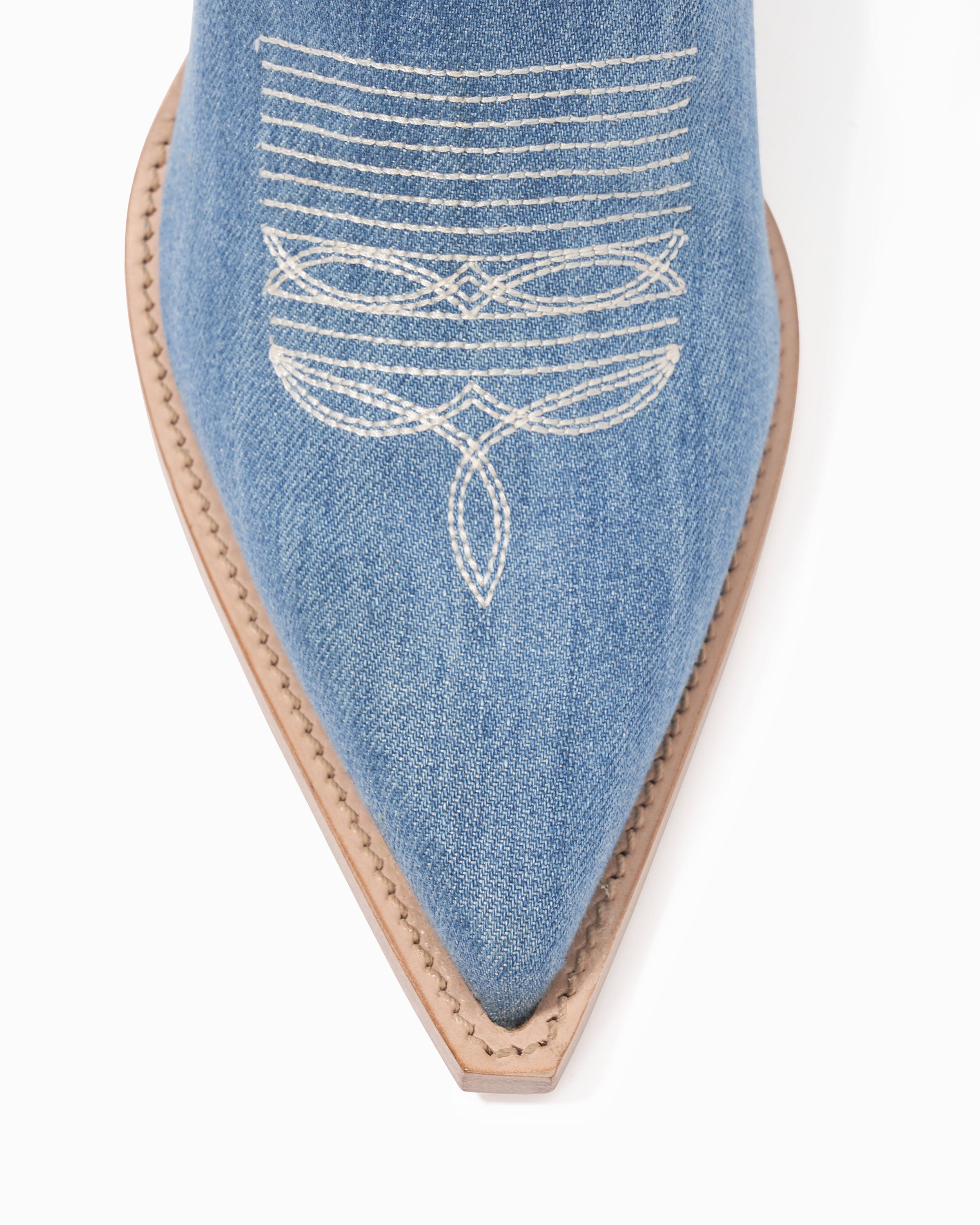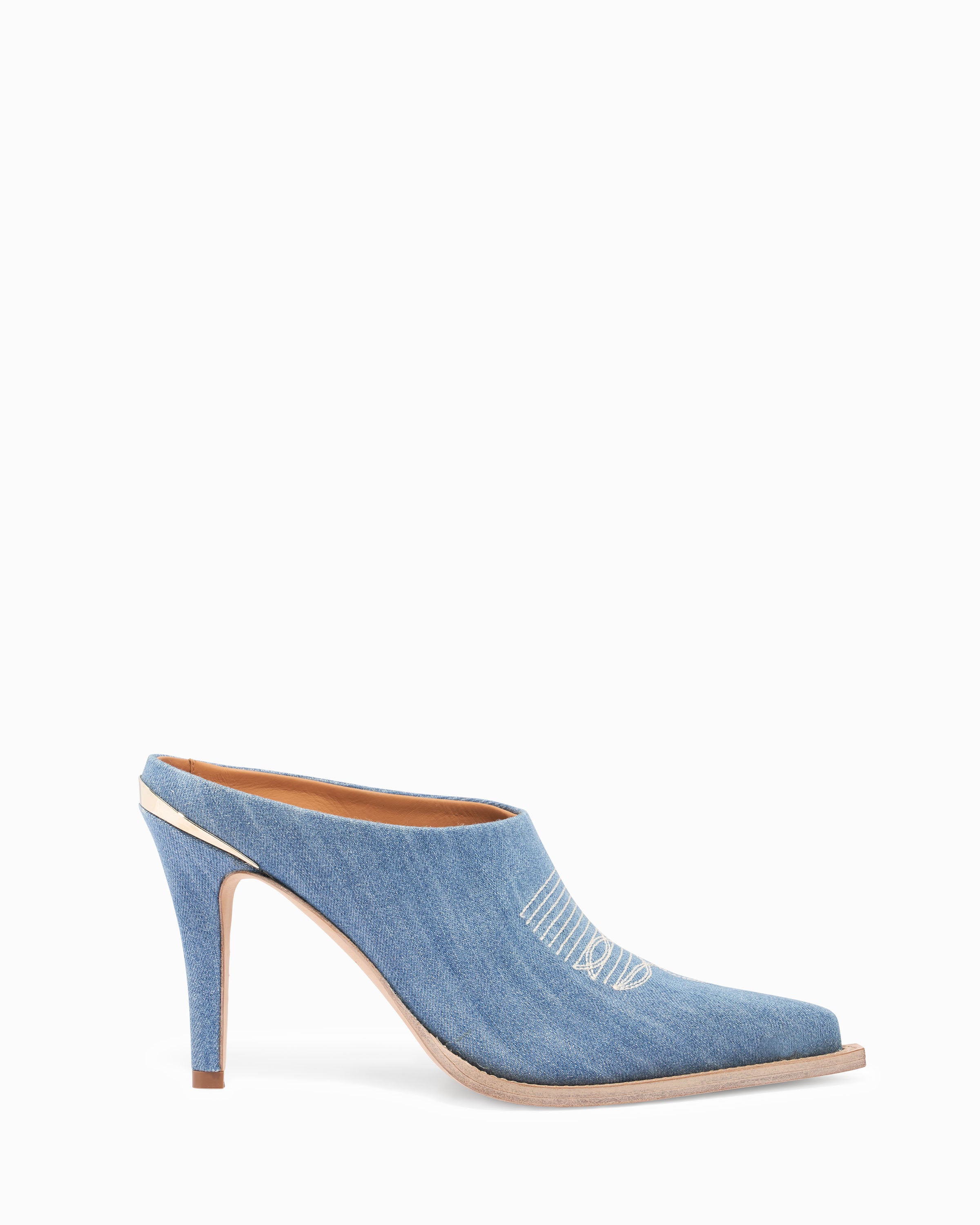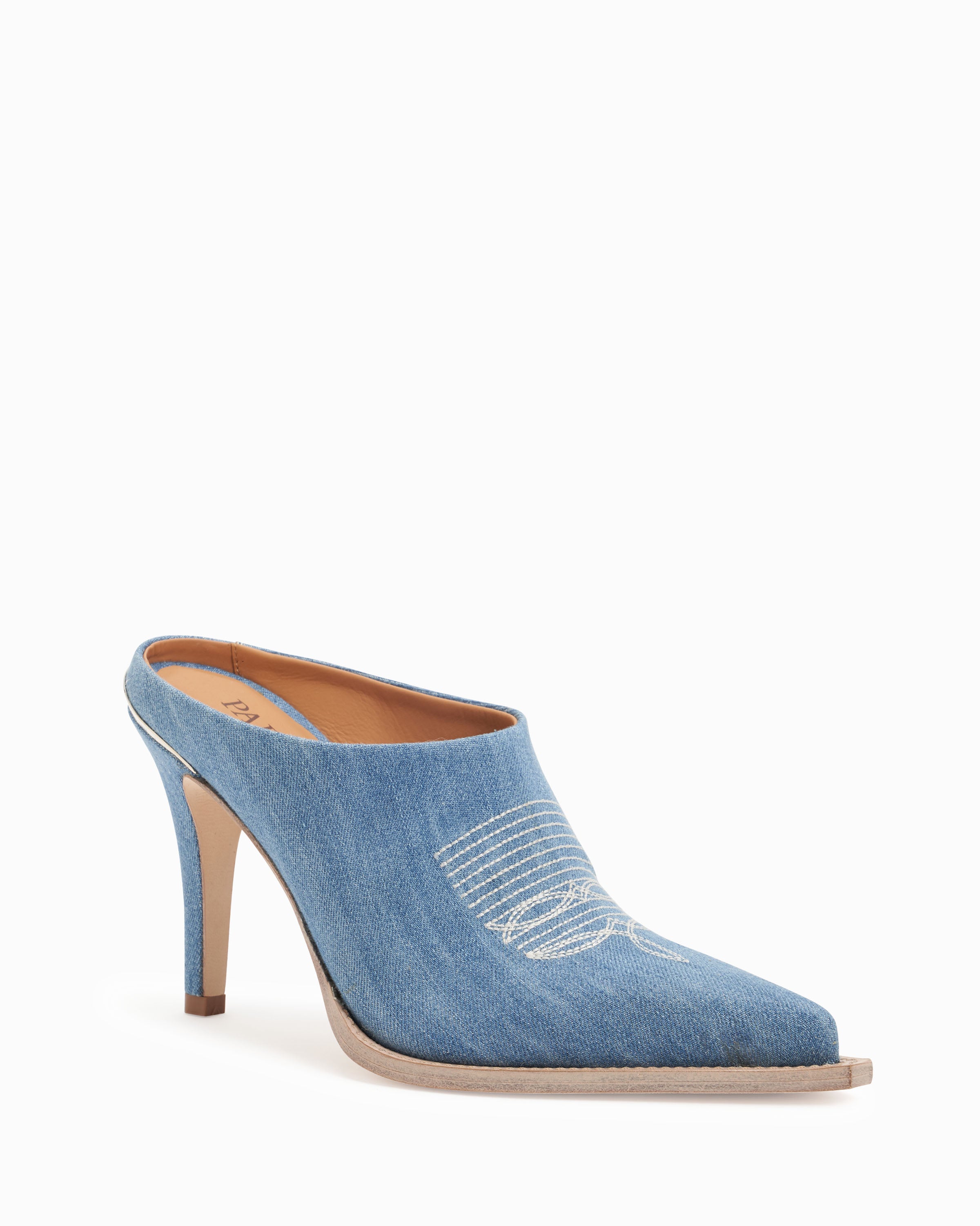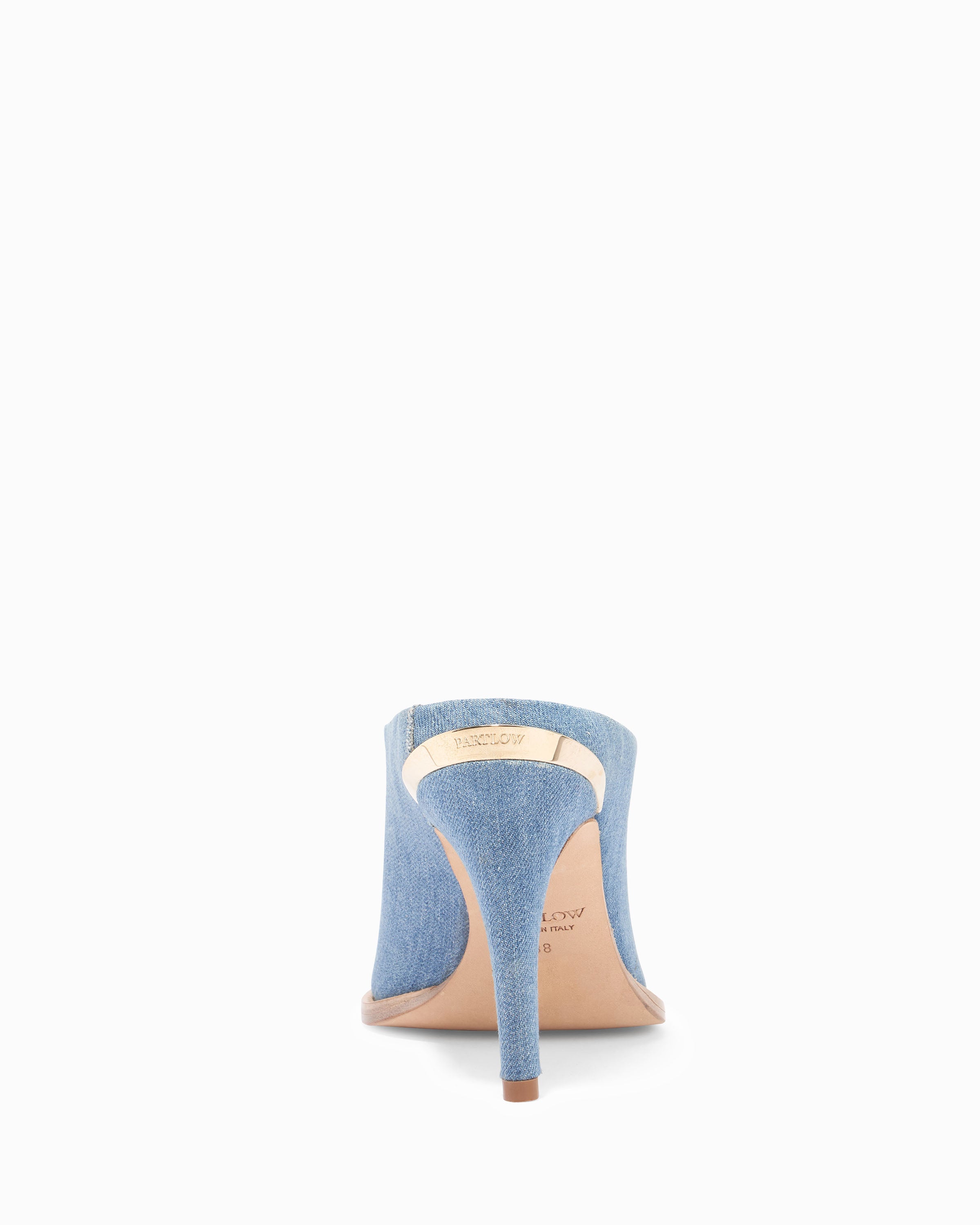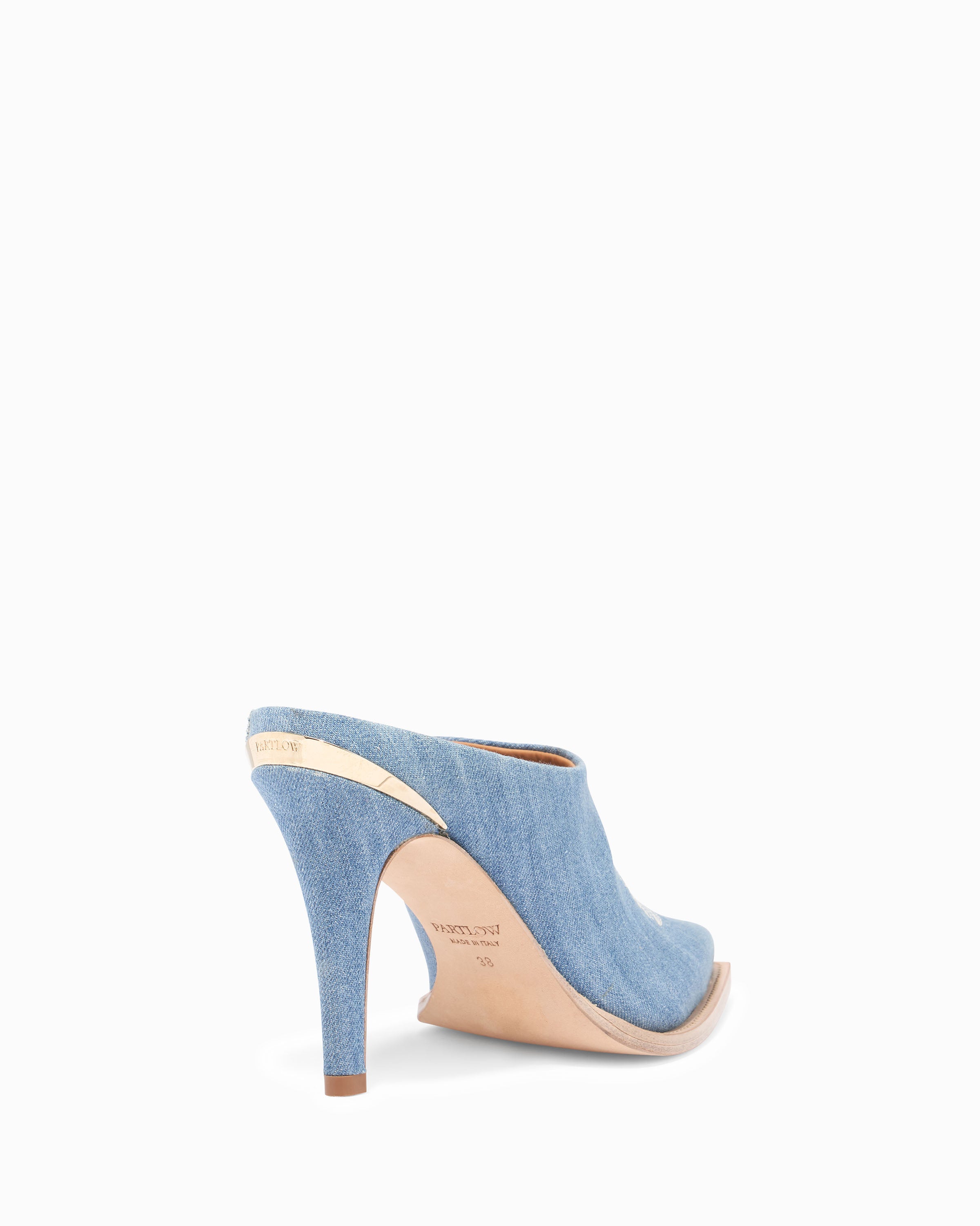 Slip on mule. Denim fabric upper with stitch detailing on vamp. 95mm/3.75" heel height. 6mm padded insole. Leather lining. Leather outsole with stitched welt. Signature Partlow plaque. Handcrafted in Italy.