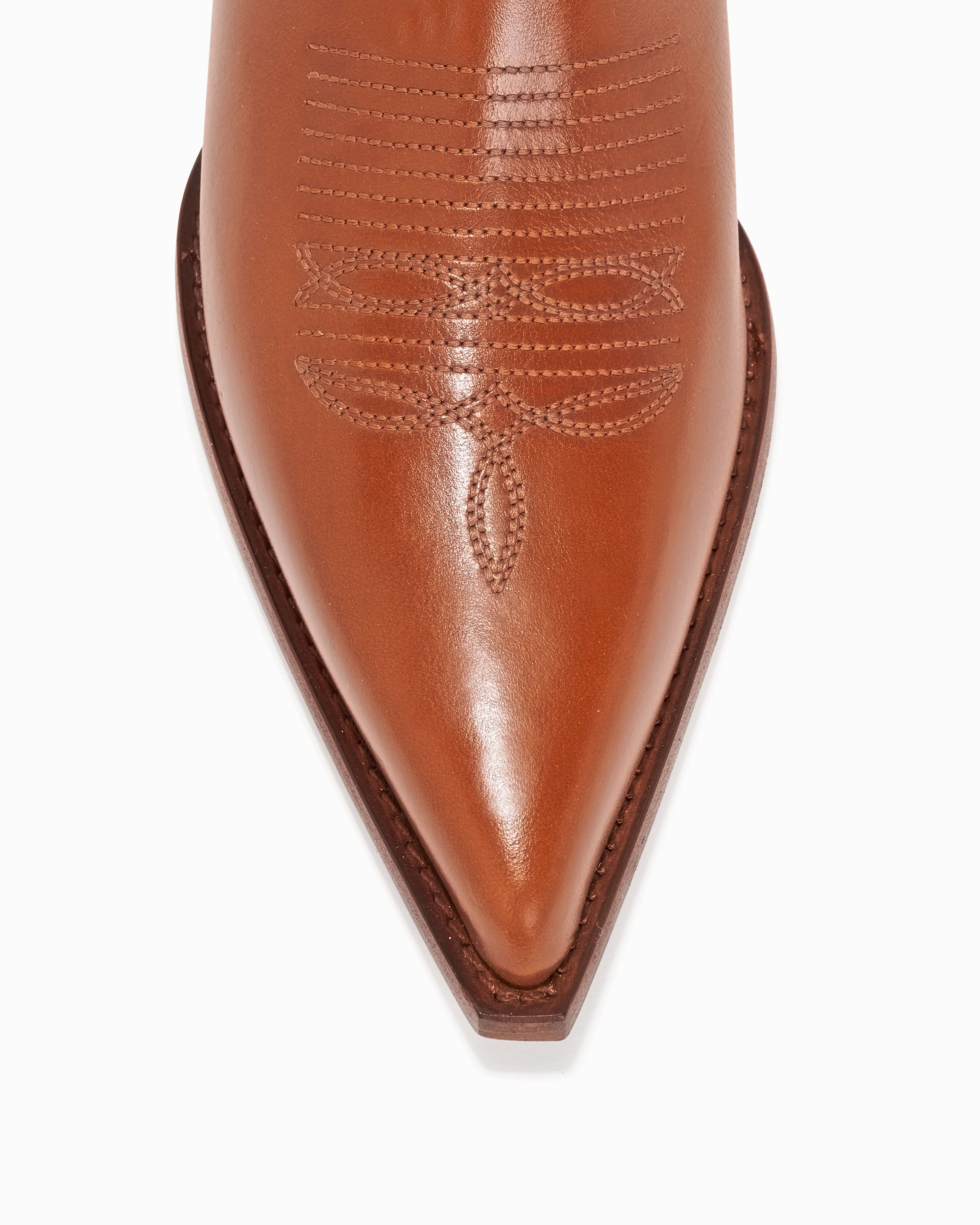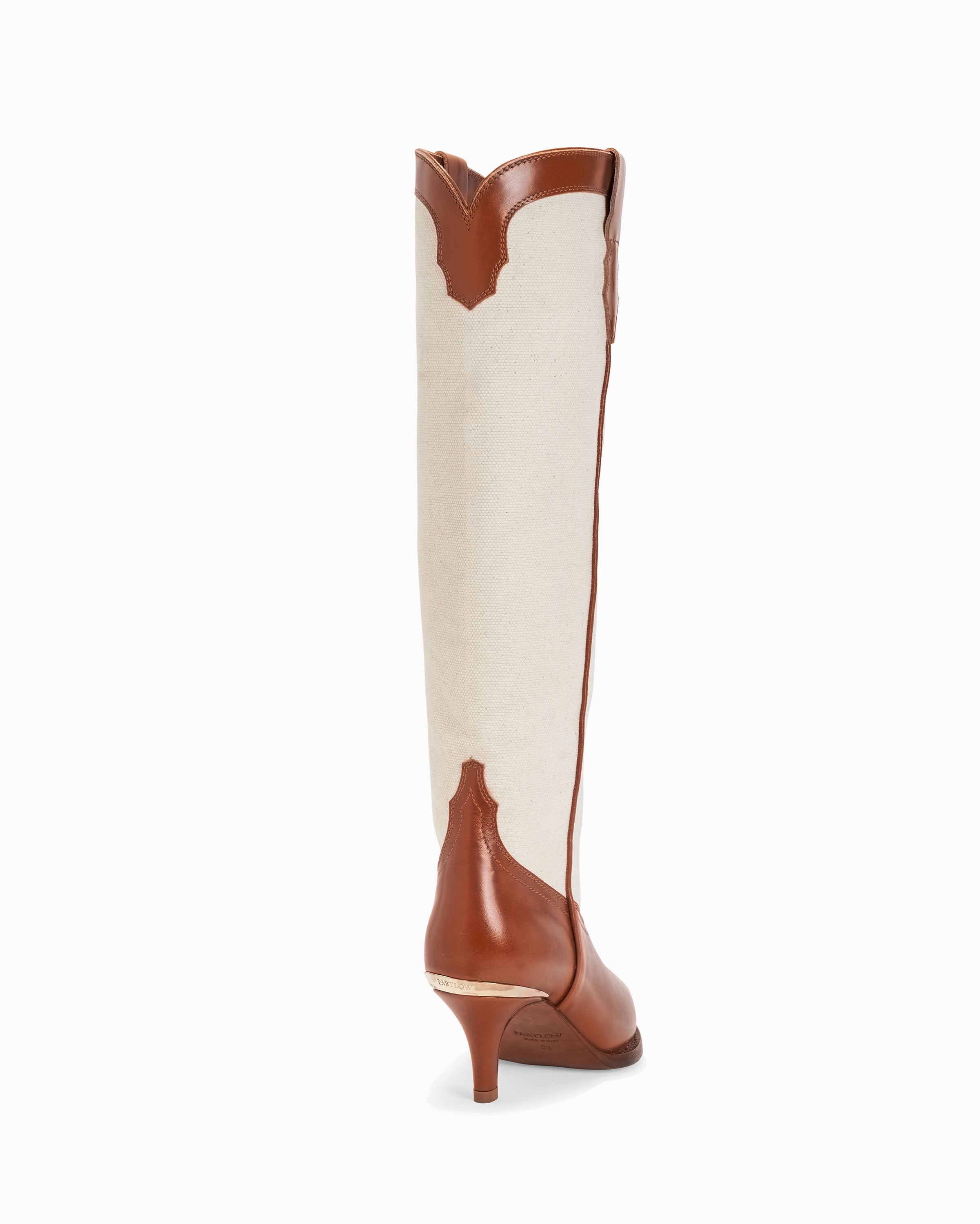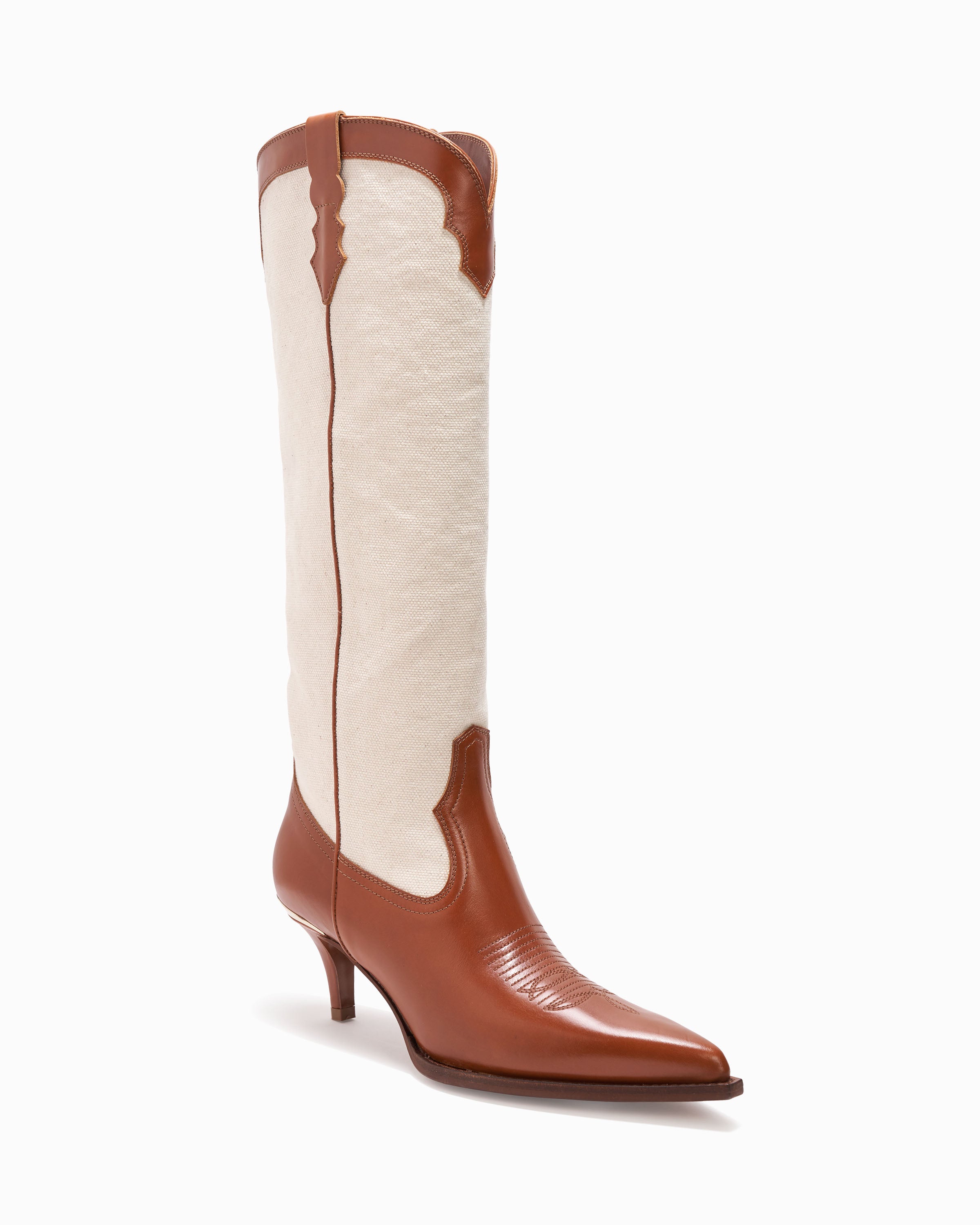 Pull on Knee High boot w/Classic Cowboy silhouette. Calf and Canvas upper. 60mm /2.36" heel height. 6mm padded insole. Leather lining. Leather outsole. Signature Partlow plaque. Handcrafted in Italy.