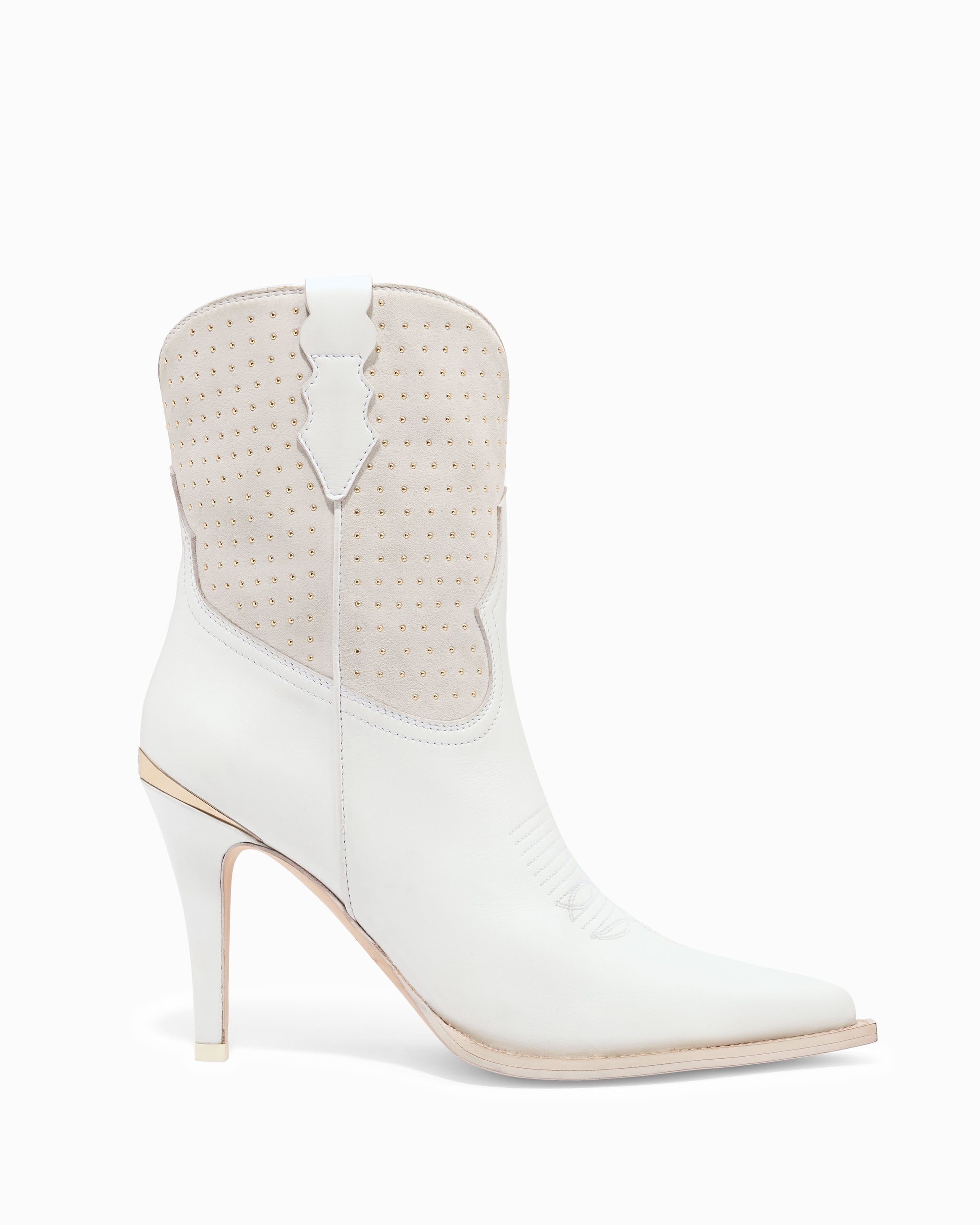 Pull on ankle boot. Calf and suede upper with micro studs. 95mm/3.75" heel height. 6mm padded insole. Leather lining. Leather outsole with stitched welt. Signature Partlow plaque. Handcrafted in Italy.