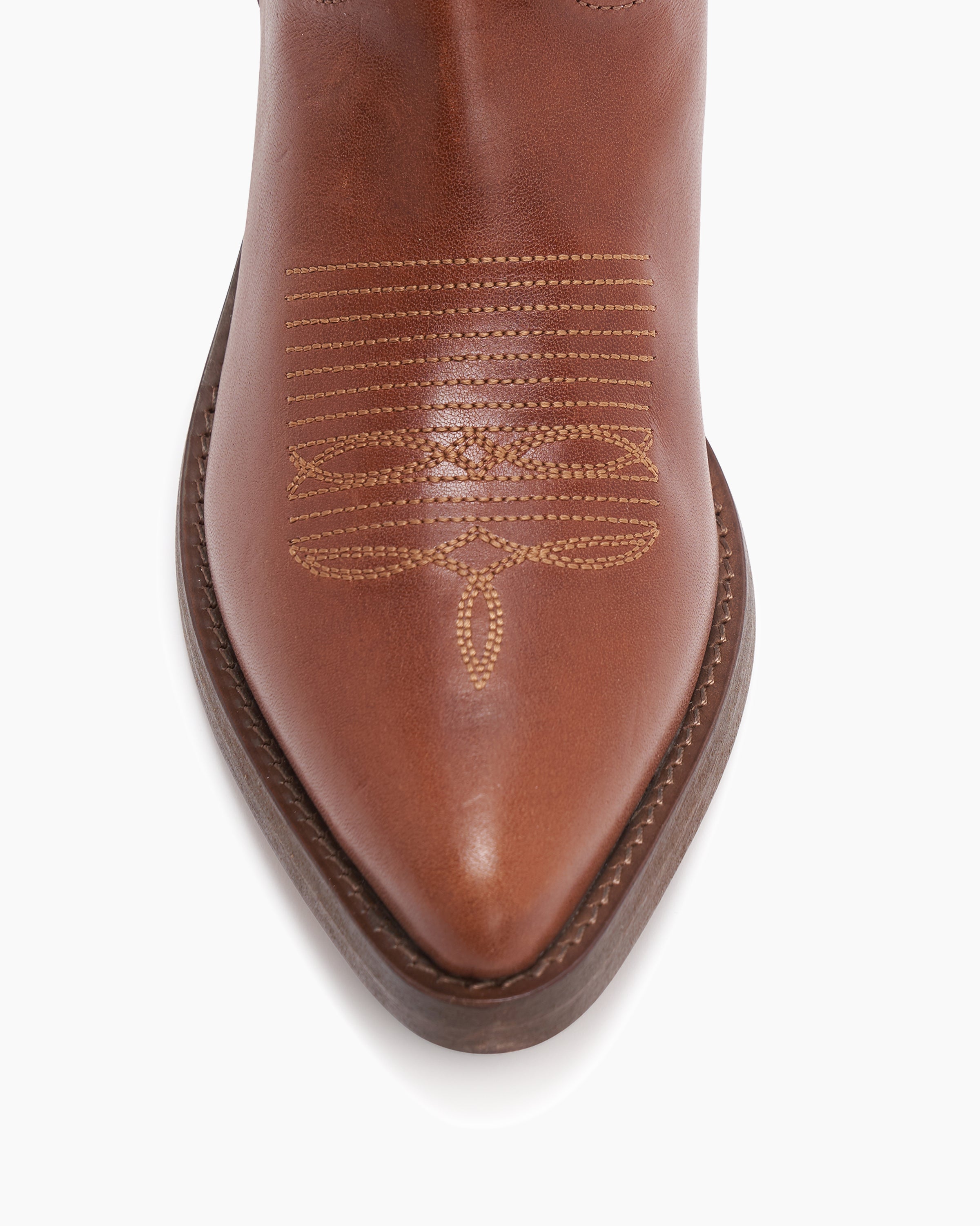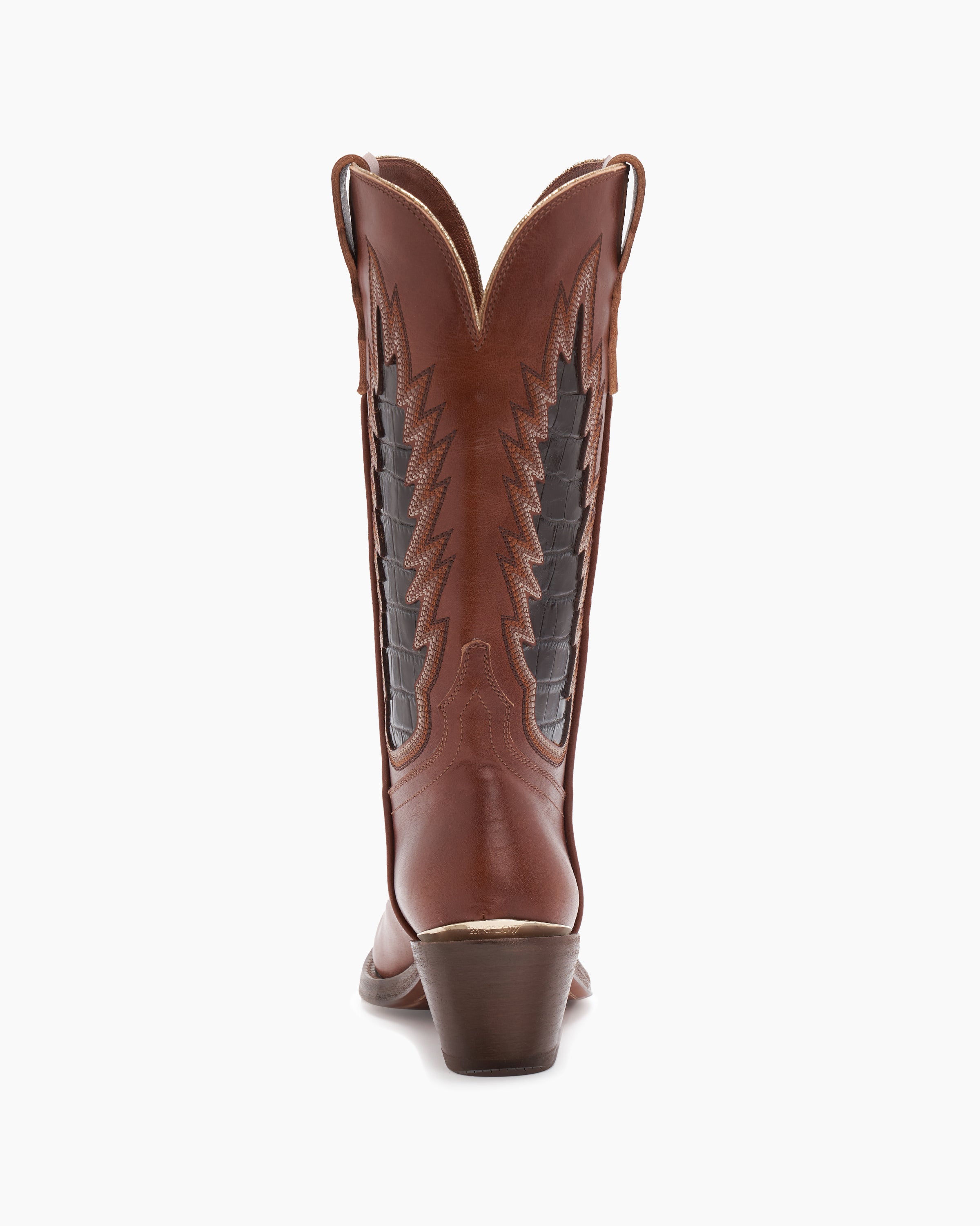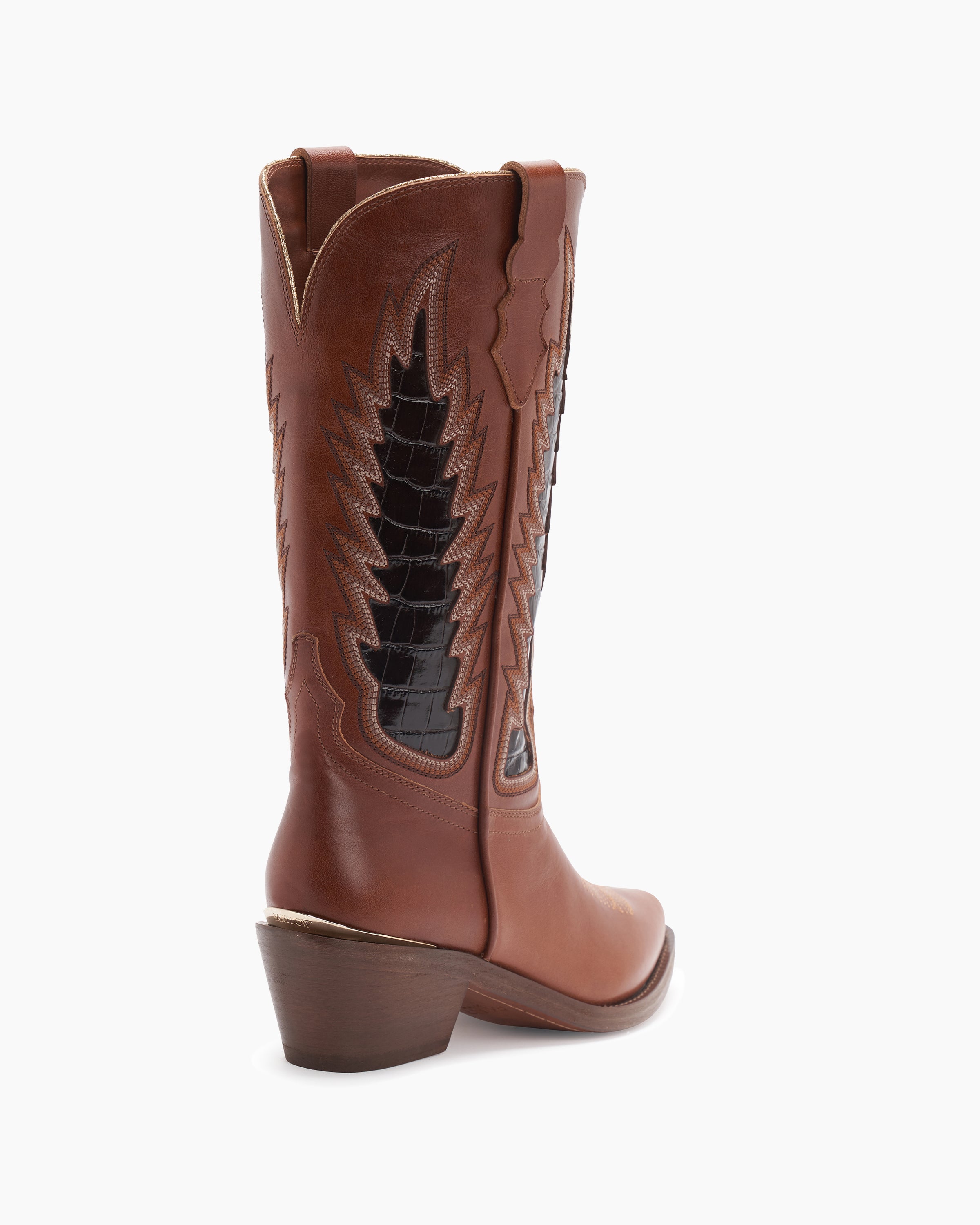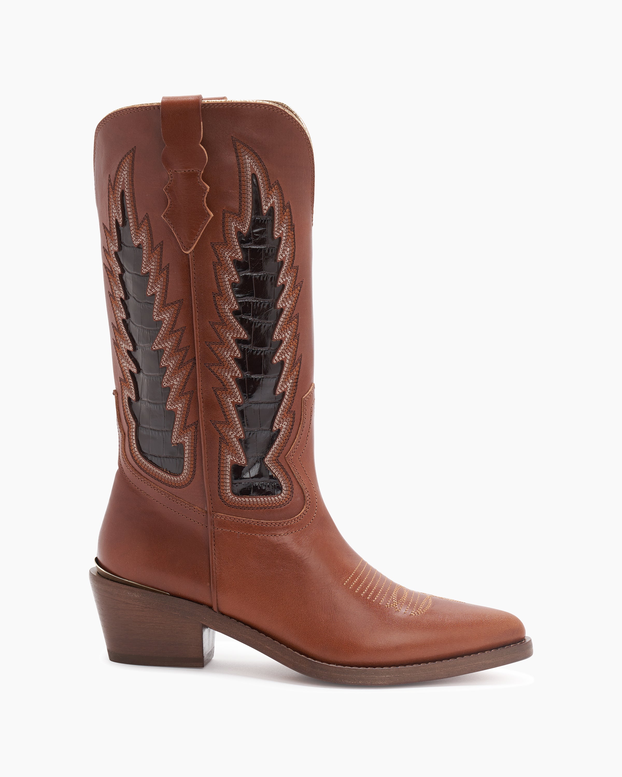 Pull on classic western style boot silhouette created from a vegetable dyed leather upper with faux croc and ombre stitch detail, leather lining, leather outsole with stitched welt. Heel height: 55mm/2.17", 6mm padded insole. Featuring the signature Partlow plaque. Handcrafted in Italy.