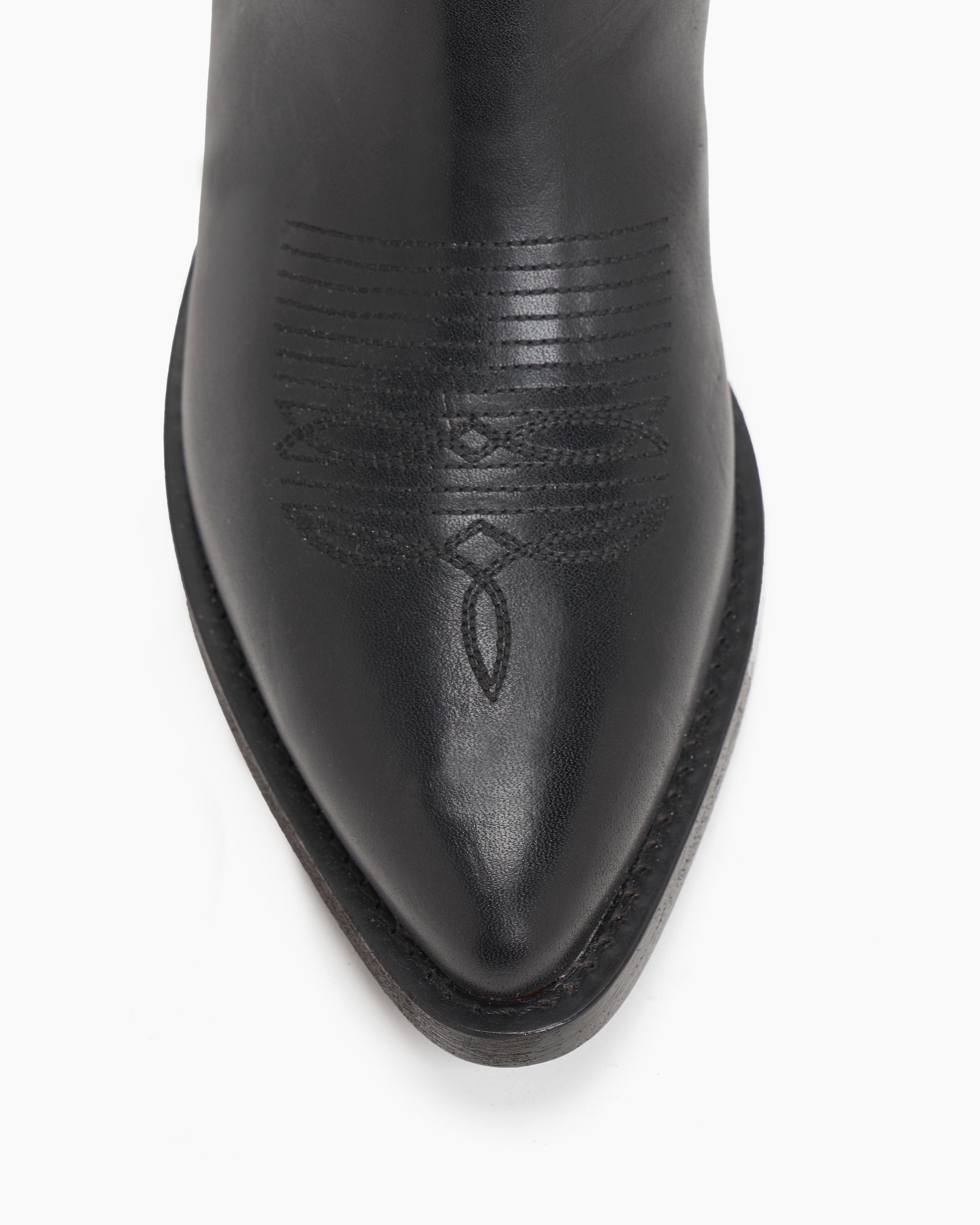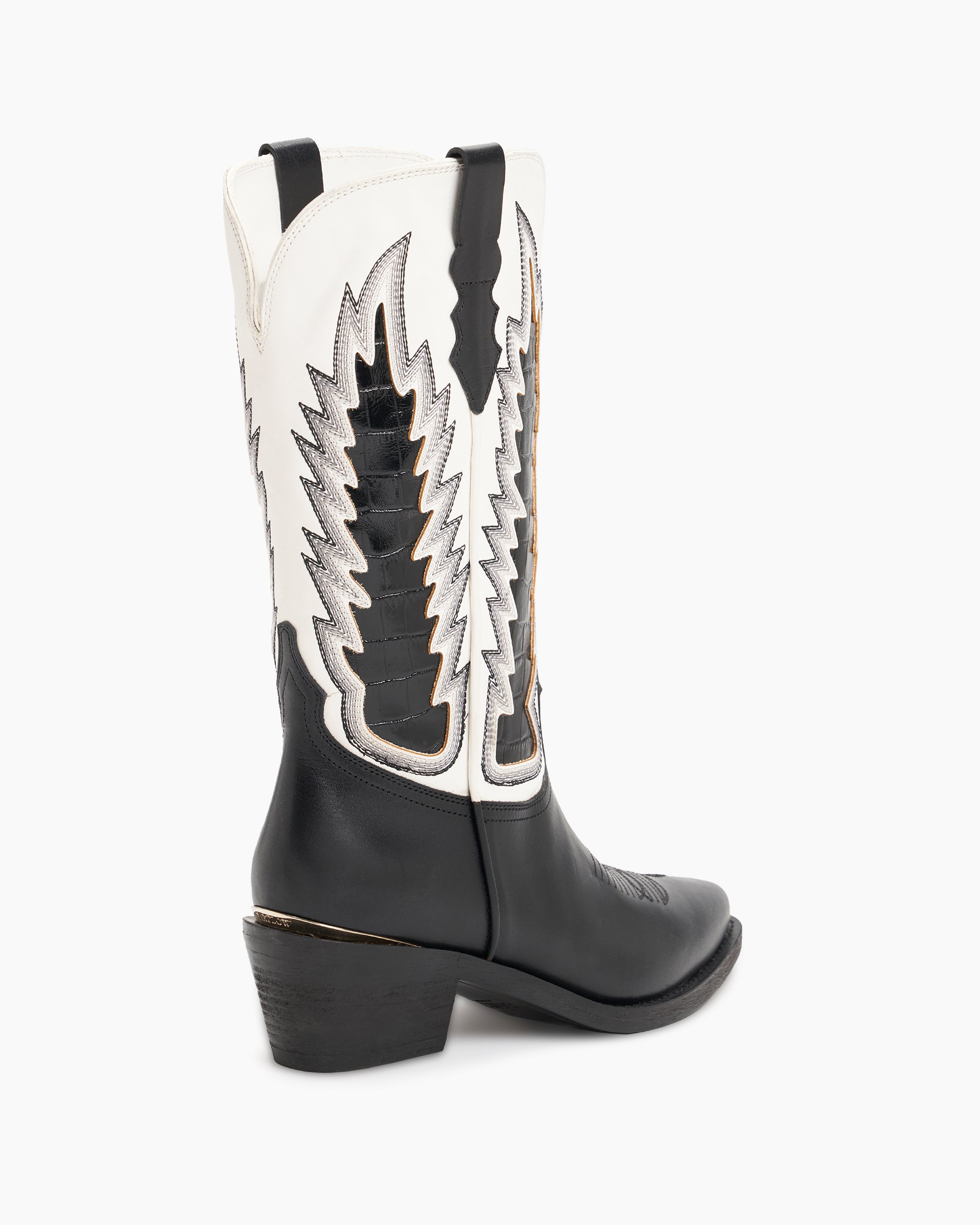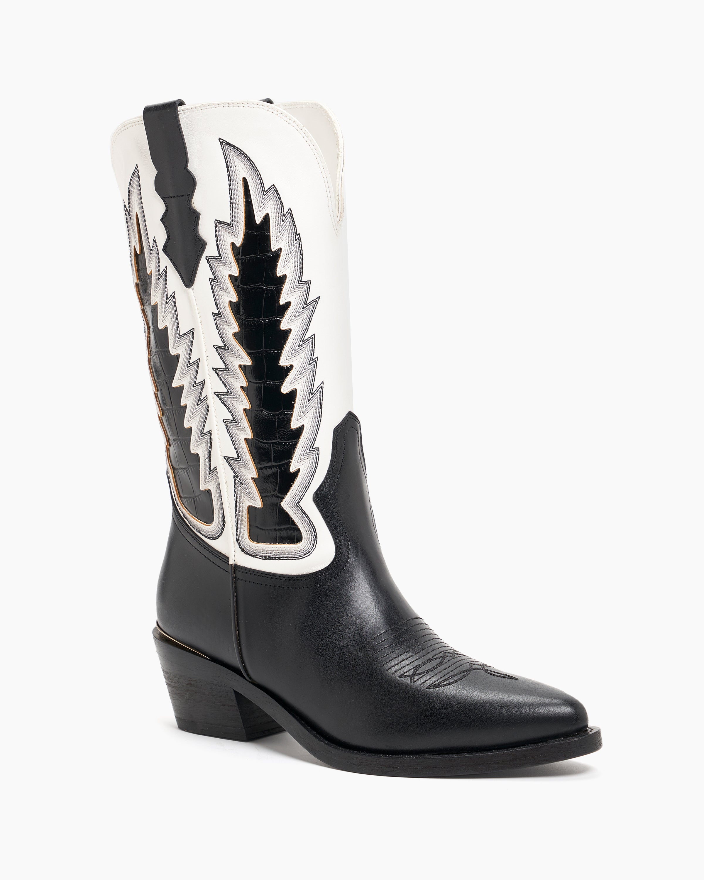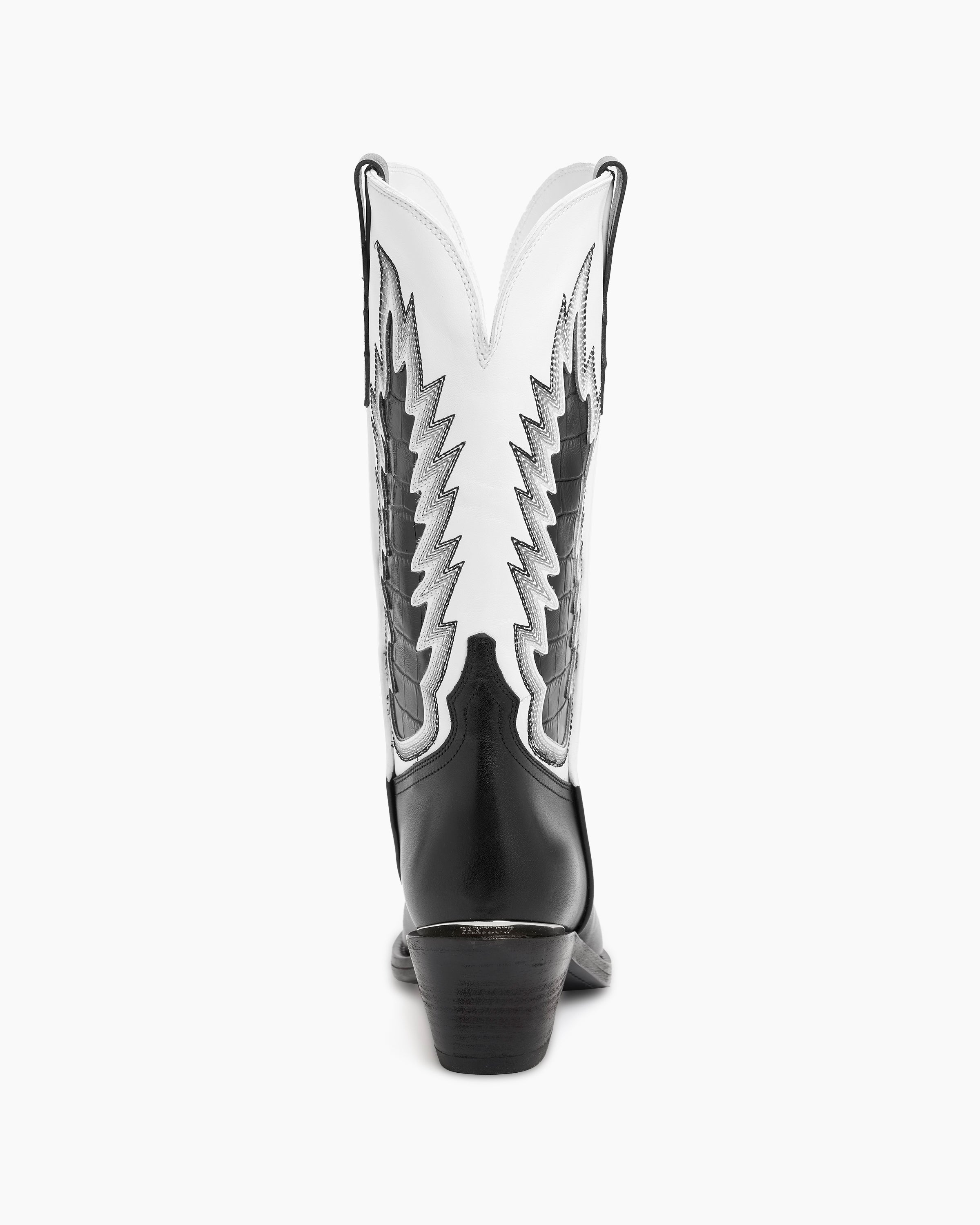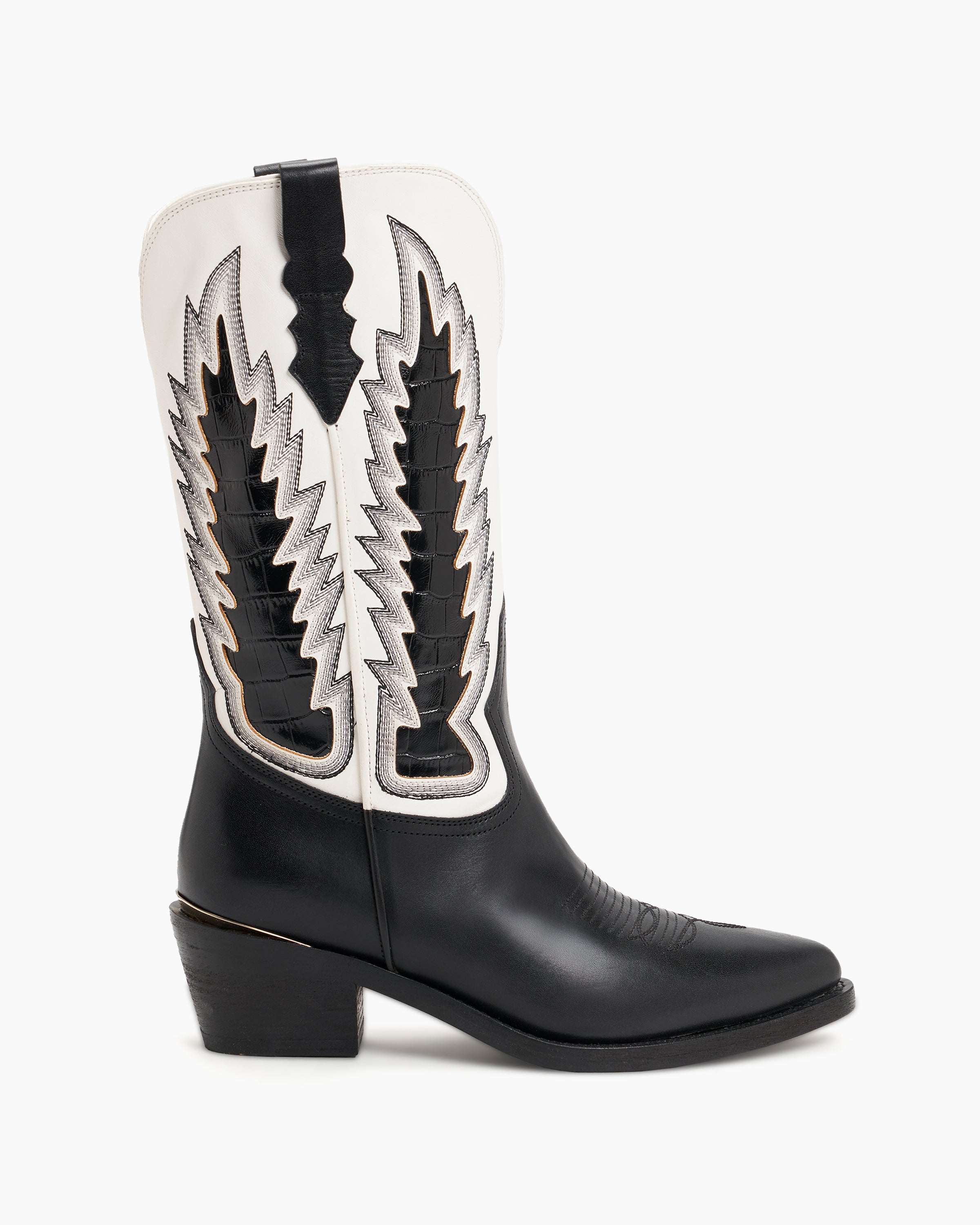 Pull on classic Cowboy silhouette. Vegetable dyed leather upper with faux croc and ombre stitch detail. 55mm/2.17" heel height. 6mm padded insole. Leather lining. Leather outsole with stitched welt. Signature Partlow plaque. Handcrafted in Italy.